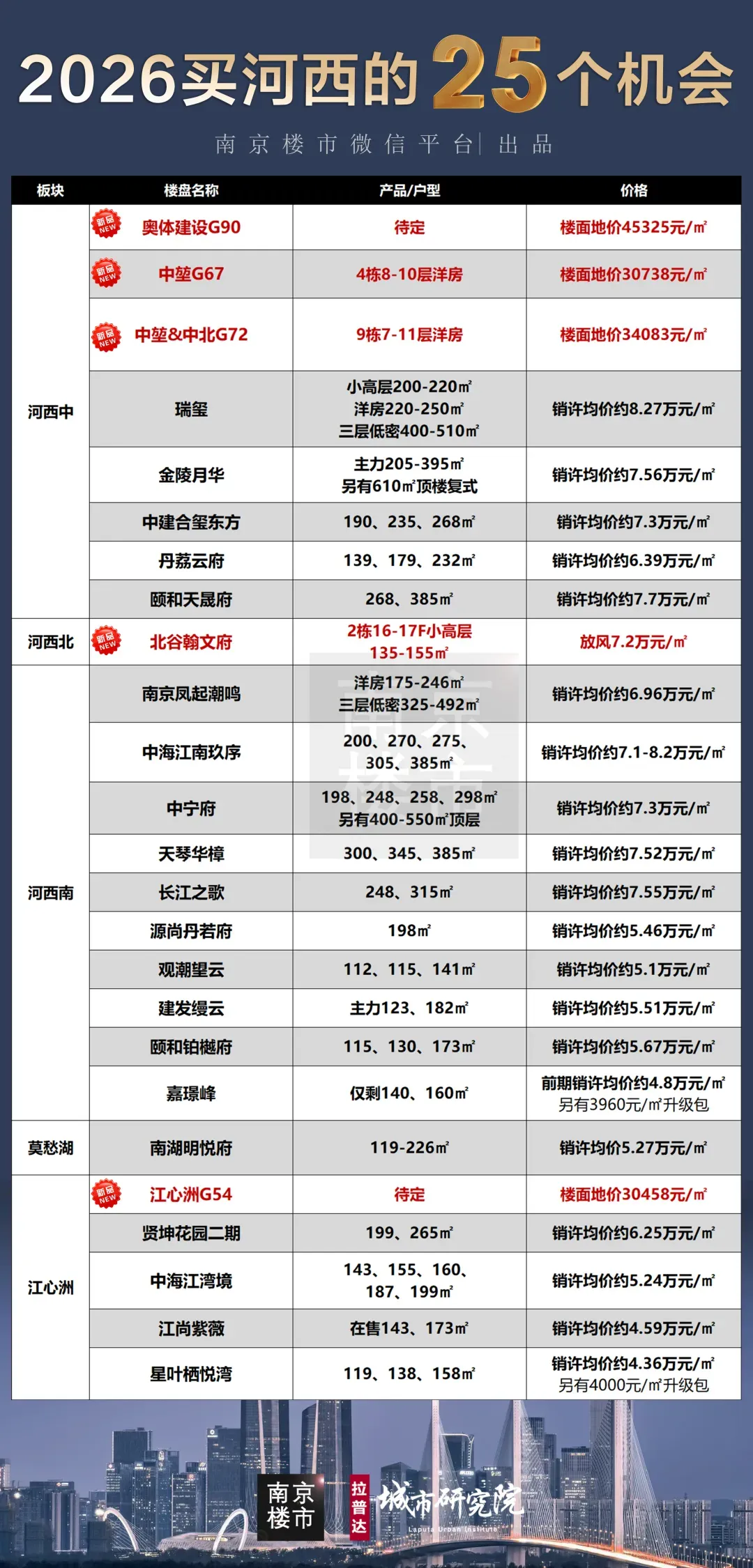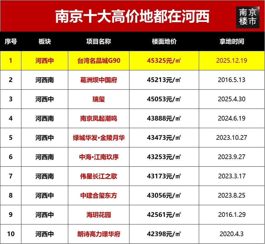 纵观全南京,河西依然是价值高地,2025年河西出让中堃&中北G72、中堃G67、北谷瀚文府(G47)、招商蛇口G28、奥体建设G90这5幅地块。目前,南京地价最高的10家楼盘都在河西,其中台湾名品城G90是新晋地王。