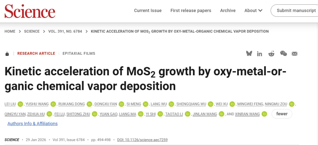 LEI LIU, et al. Kinetic acceleration of MoS2 growth by oxy-metal-organic chemical vapor deposition. Science, 2026, 391(6784)