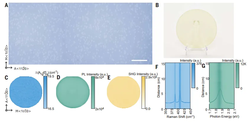 研究在150毫米蓝宝石衬底上实现全片MoS₂晶畴100%单向对齐拼接,拉曼峰位差18.5±0.23 cm⁻¹,PL强度波动<9%,SHG映射均匀,为二维半导体商业化铺平道路。