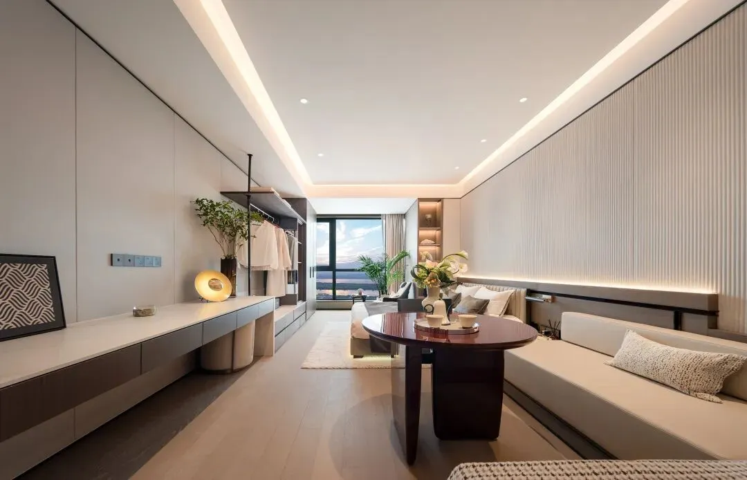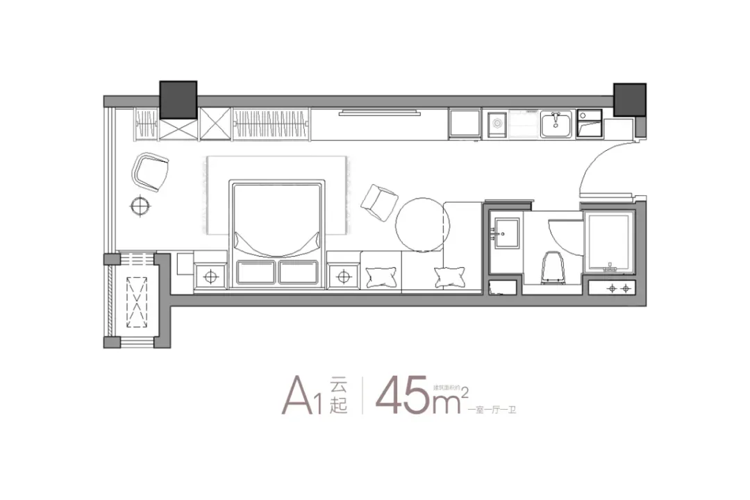 建面约45㎡户型酒店式套房设计,此户型功能性很强,入口设置嵌入式玄关柜,预留了餐厅空间,临窗还规划出观景的休闲区。