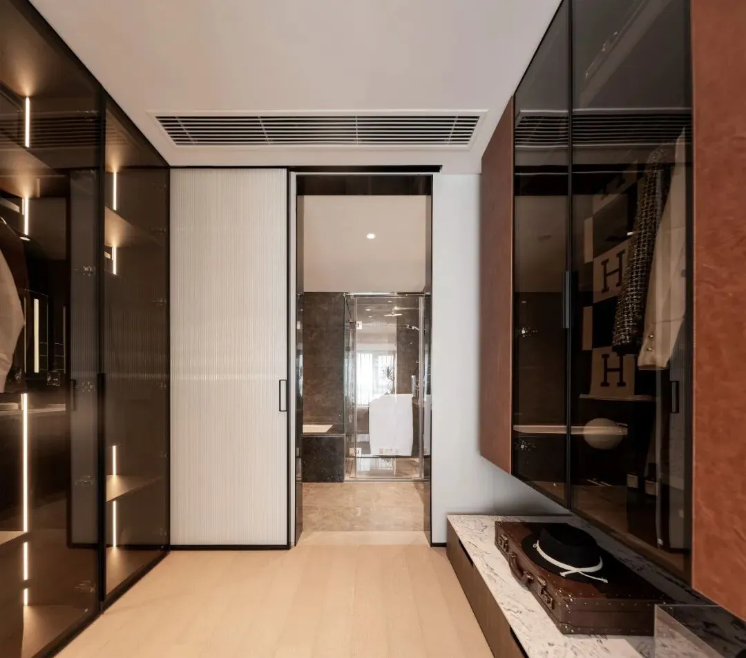 入户一整面的玄关柜,实现收纳自由;厨房拥有西厨岛台以及通顶的橱柜,嵌入式冰箱的位置预留好,有一小部分空间做玻璃酒柜;主卧套房,主卫涵盖嵌入式浴缸、独立式淋浴屏,还有衣帽间设计。
