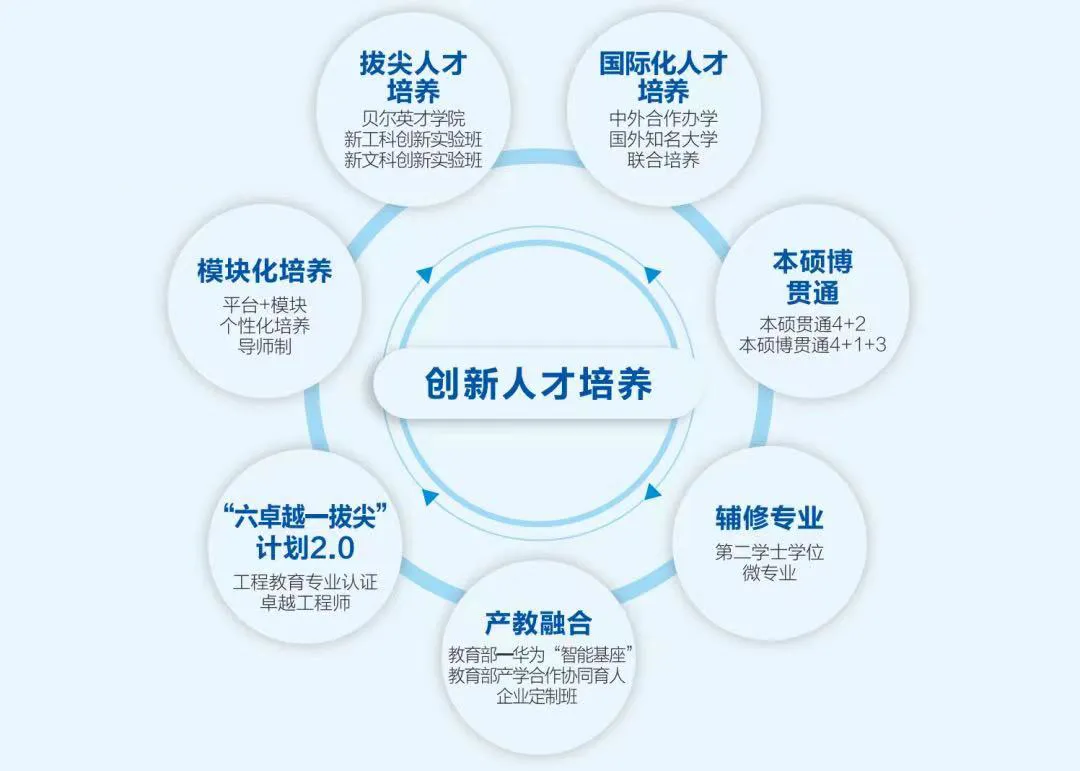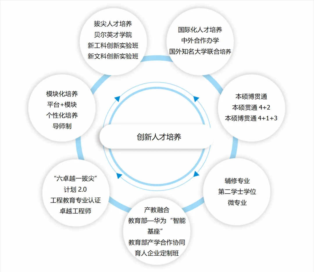 学校聚焦国家“卡脖子”关键领域自立自强的重大战略需要,紧跟信息通信行业发展趋势,主动适应企业人才需求,实施了“拔尖创新人才培养”“卓越工程师培养”“校企协同人才培养”“国际合作人才培养”等培养模式改革,持续推进创新人才培养体制机制改革。