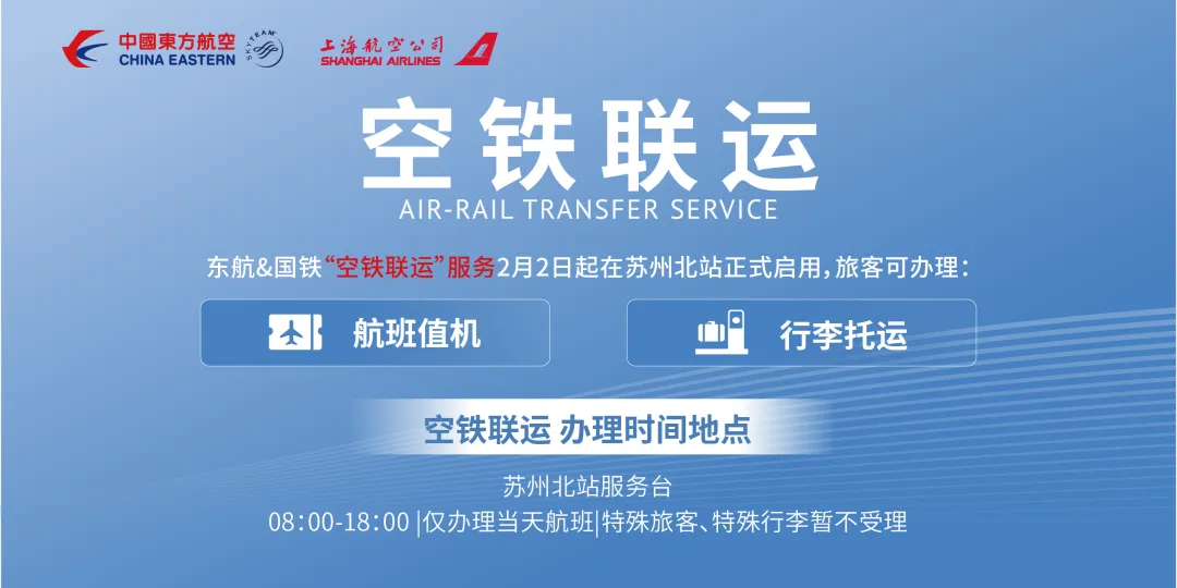 预约完成后,在出行当日前往位于高铁苏州北站的服务站点(12306服务台)提前办理好航班值机、行李托运、领取登机牌(行李将通过智能系统精准分拣、无缝转运),到达机场后无需重复值机+托运行李,可直接通过安检进入候机区。(*详情请咨询服务站点东航工作人员)