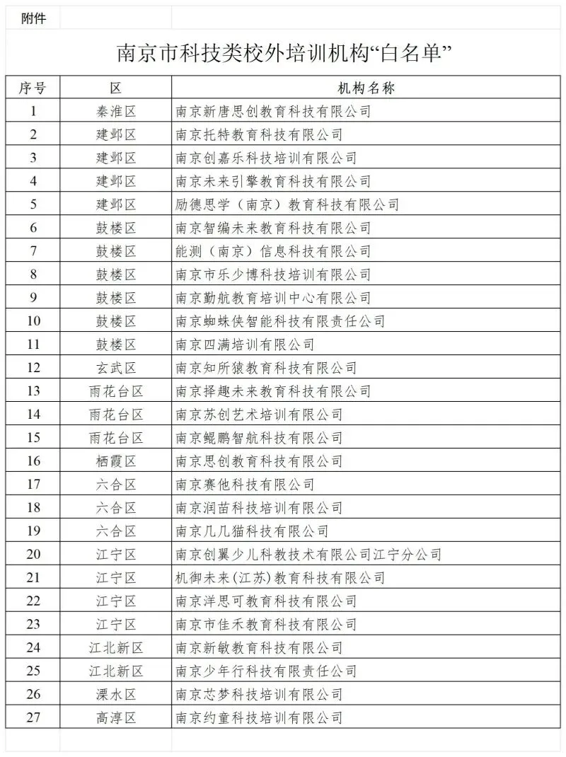 近日,南京市教育局发布公告:为落实《省教育厅等五部门关于规范引导第三方机构参与中小学课后服务的通知》要求,支持并规范引导非学科类校外培训机构有序参与中小学课后服务,现将经科技、体育部门审批(核),在市场监管、民政部门登记注册,并实施全流程监管的科技类、体育类校外培训机构“白名单”向社会公布(截至2026年1月30日)。