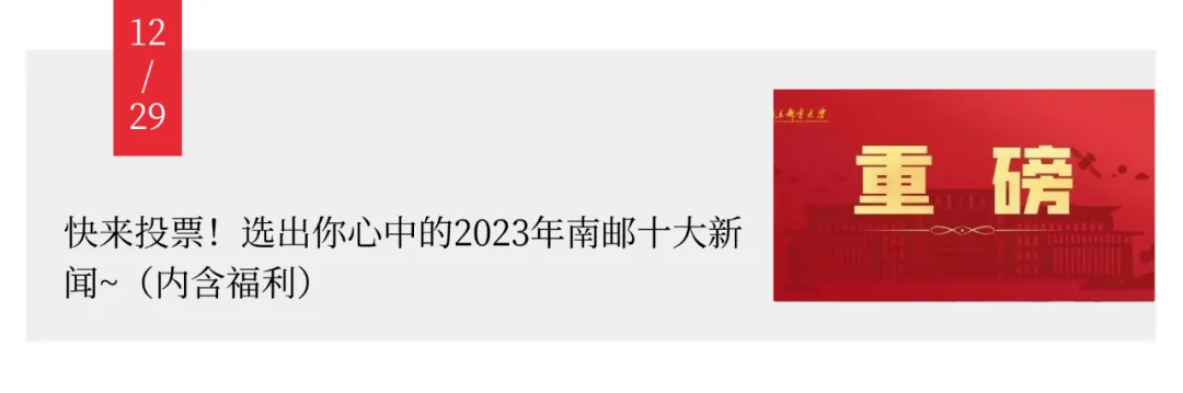 生生不息,是为传承。今天的南邮,是继往开来、守正创新的红色南邮。这一年,我们高擎思想旗帜,凝聚文化力量。学校牢记为党育人、为国育才的初心使命,全面贯彻党的教育方针,落实立德树人根本任务。学校连续三年获江苏省综合考核第一等次。新一届领导班子带领师生赴东甘霖村“重走南邮路”,在办学旧址讲实景思政课,感悟南邮的精神之源。与雨花台烈士陵园管理局共建“大思政”红色育人实践基地,联合申报项目入选全国“大思政课”优质资源精品项目,连续3年获全国暑期“三下乡”社会实践优秀单位,连续4年获全国西部计划绩效考核优秀等次,获第十四届中国青年志愿者优秀组织奖。《一堂不同寻常的党课》获评教育部关工委2023年“读懂中国”优秀舞台剧,“中华龙狮舞”传承项目入选江苏省中华优秀传统文化传承基地,舞蹈作品《第一课》将代表江苏参加全国第七届大学生艺术展演。
