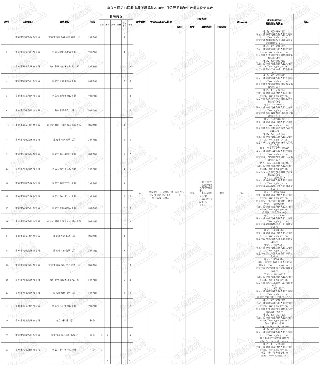 根据教育事业发展和教师队伍建设需要,南京市雨花台区教育局所属学校、幼儿园面向社会公开招聘53名编外教师,现将有关事项公告如下: