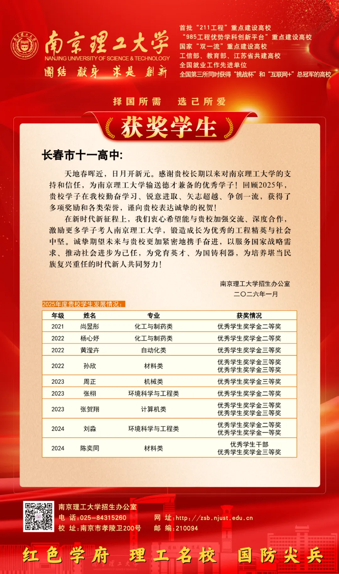 近日,南京理工大学向我校发来喜报,祝贺和表彰我校多名毕业生在该校学习期间获得优异成绩,同时祝愿十一高学子在2026年高考中取得辉煌成绩,再续华章。十一高中将与南京理工大学继续携手奋进,共育时代英才,同担家国使命。