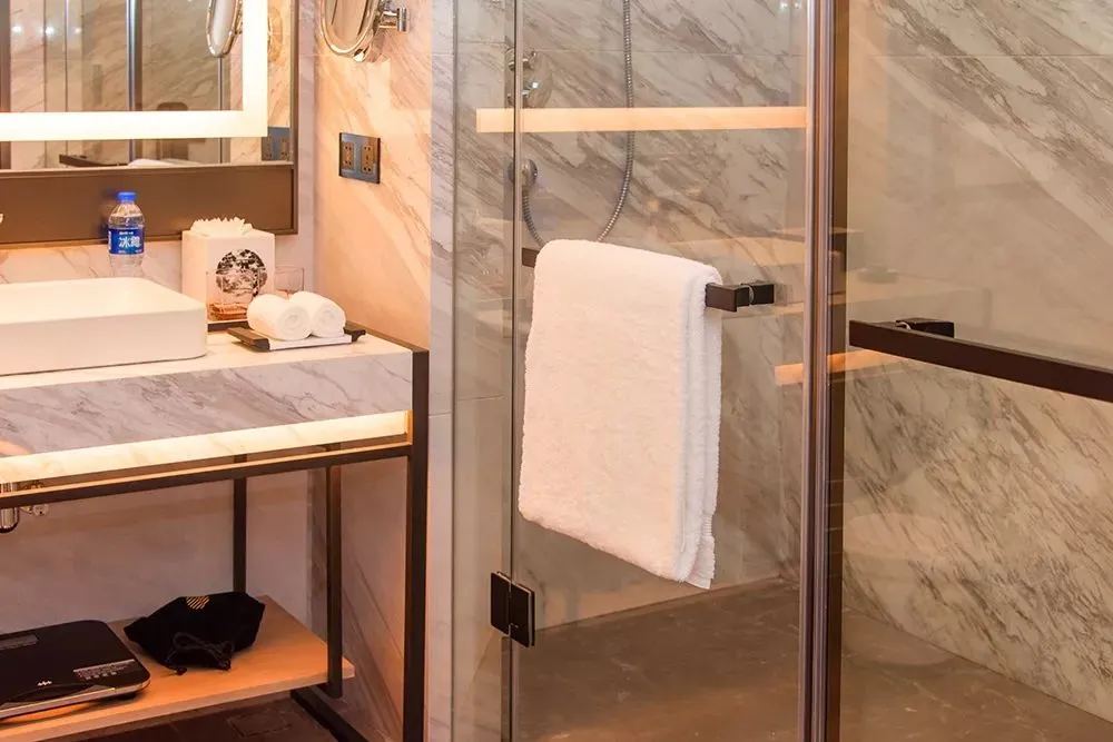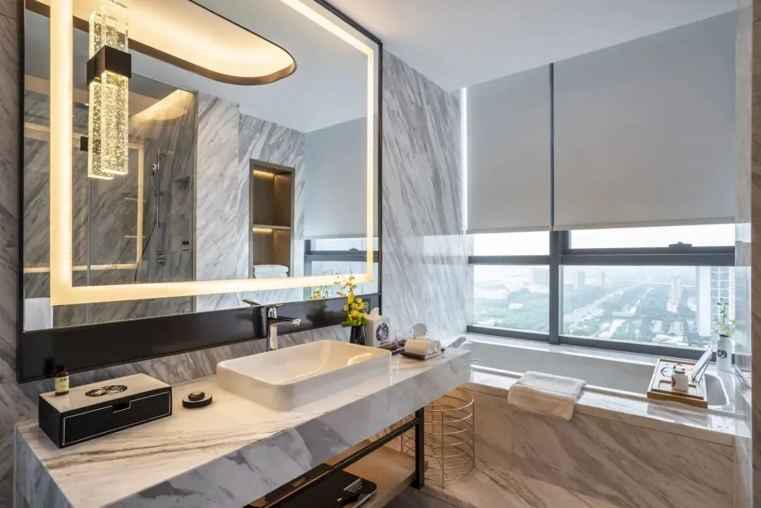 高级房面积约40㎡,内部配备全落地窗、48寸智能电视,部分房间还有电控调光玻璃,卫生间干湿分离,有浴缸和独立淋浴室。
