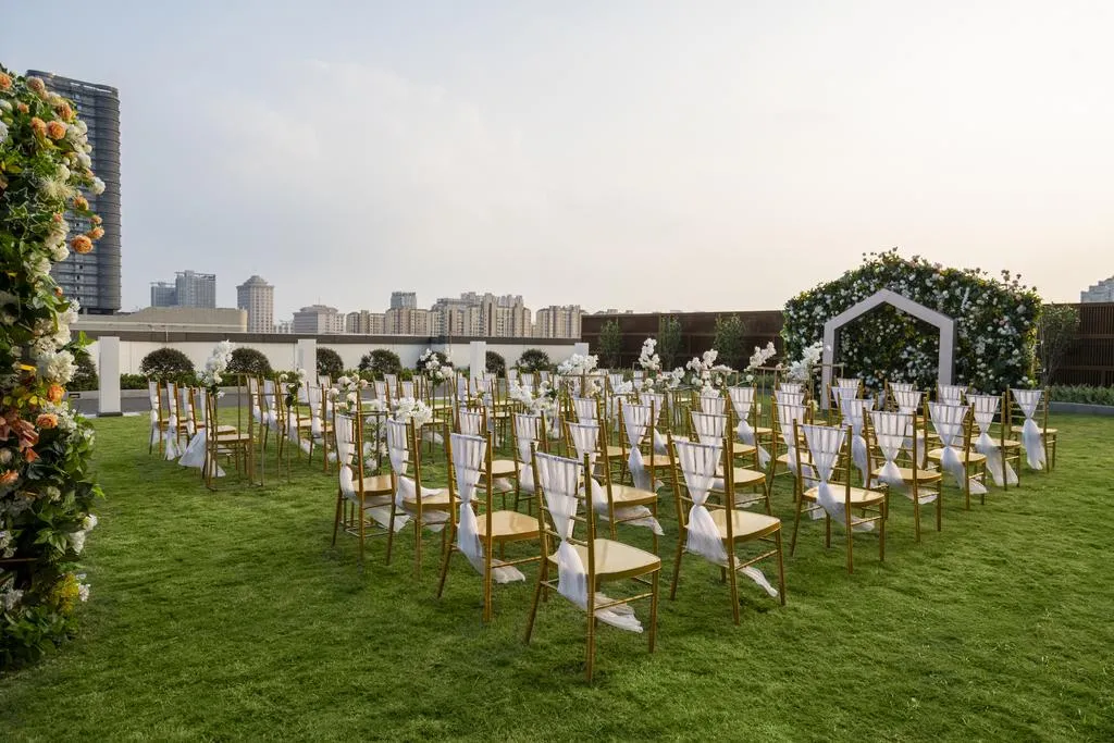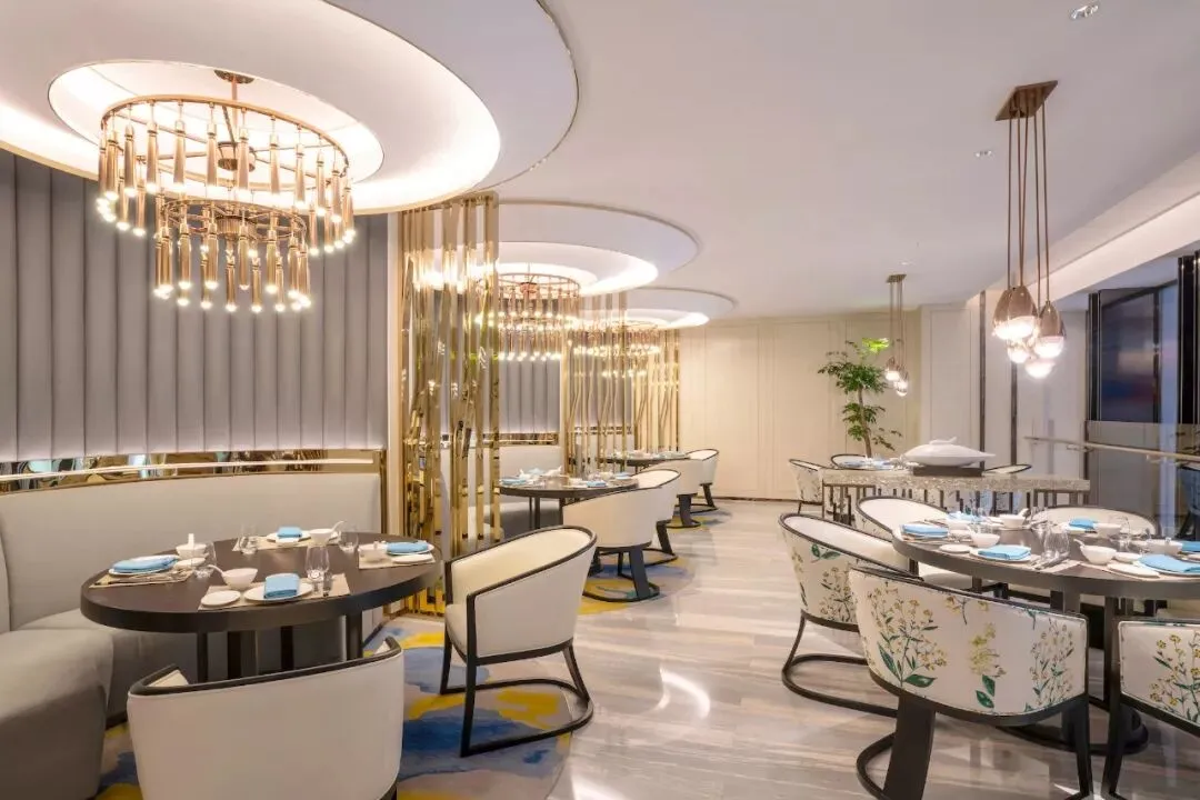走入大堂,你一眼感受不到它的姑苏调,多是法式精致氛围,沙发座椅、水晶吊灯、金黄色的皮质地毯…满满奢华。但太湖石(园林经典元素)、桂花(苏州市花)、香樟(苏州市树)都被“镶嵌”和摆放在大大小小的空间,不经意间给你小惊喜。