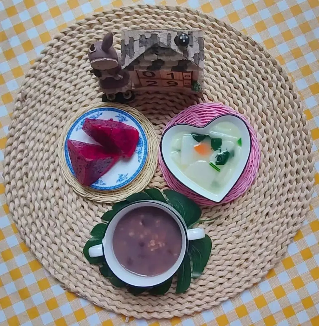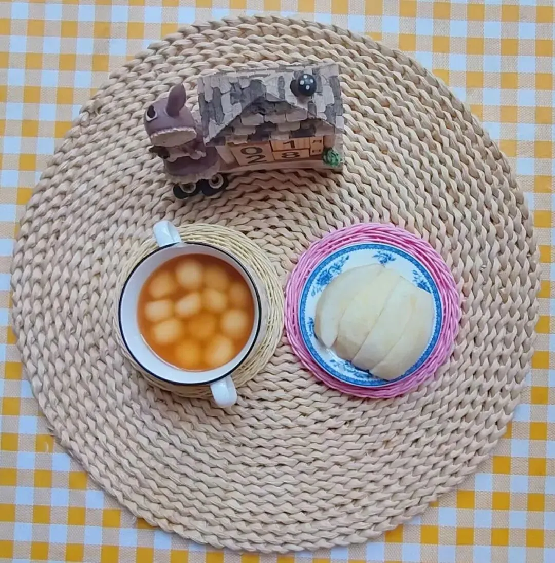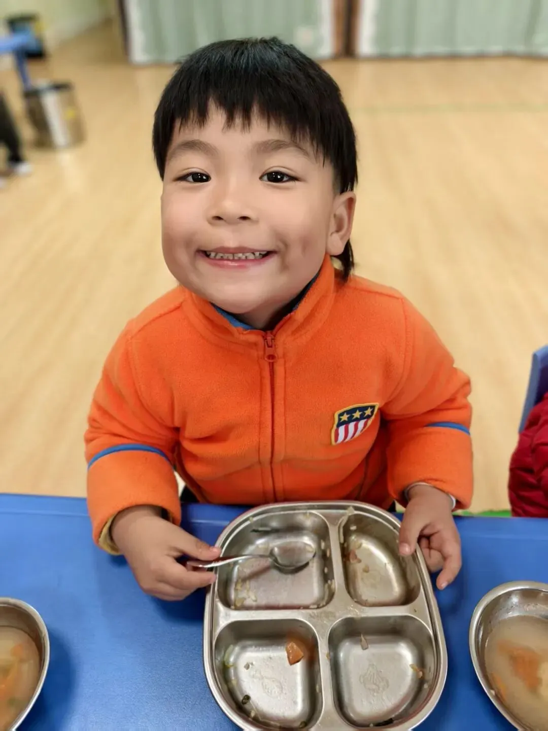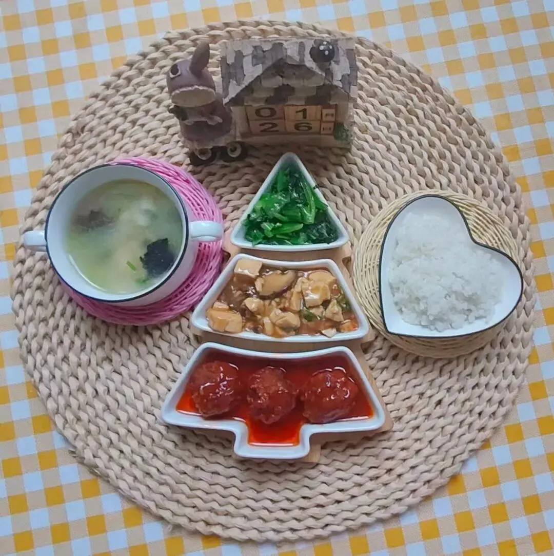 有机米饭、杨梅丸子(幼儿)、四喜丸子(托育)、家常豆腐、蒜泥小青菜、冬瓜扁尖汤