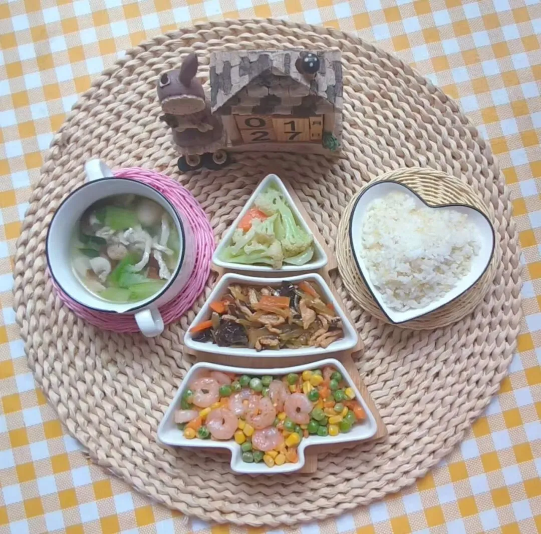 小米米饭、五彩虾仁(幼儿)、虾仁炒蛋(托育)、鱼香肉丝、胡萝卜炒花菜、三鲜汤