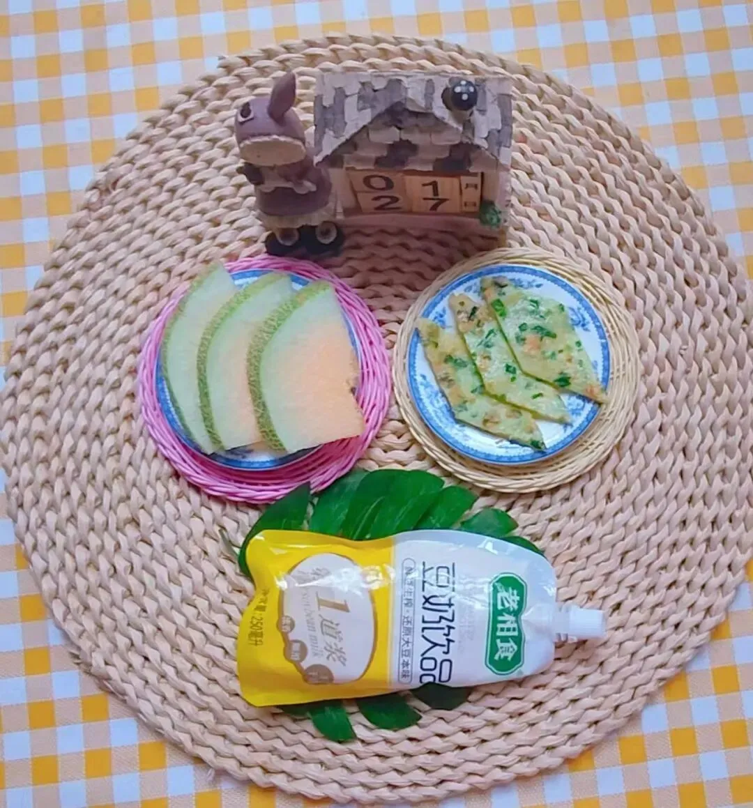 韭菜鸡蛋饼、哈密瓜、豆奶