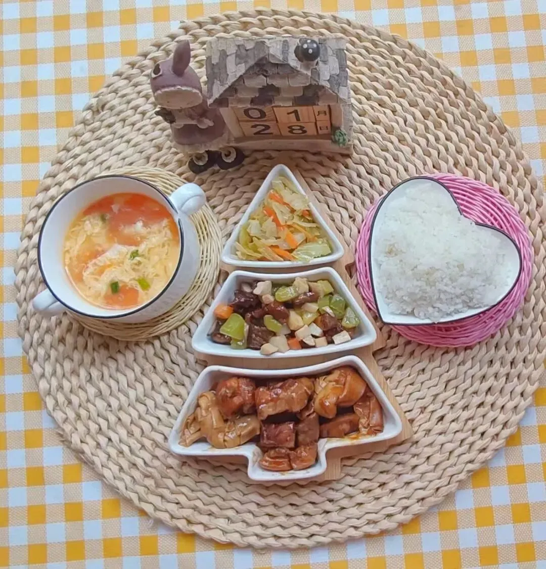 有机米饭、百叶结烧肉(幼儿)、粉蒸肉(托育)、莴笋口蘑牛肉粒、手撕包菜、番茄蛋汤