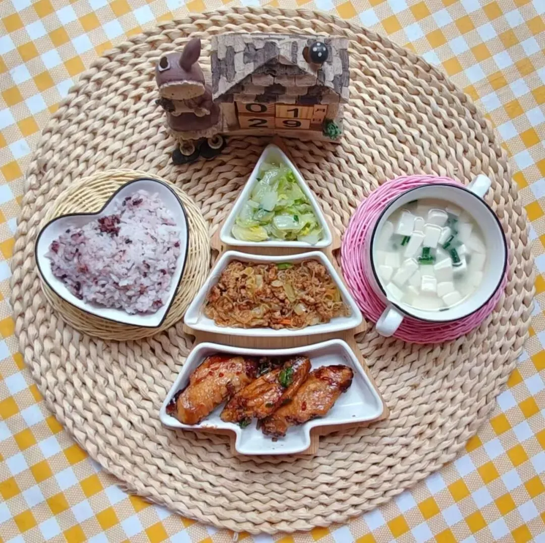 杂粮米饭、蜜汁鸡翅(幼儿)、清蒸鸡翅(托育)、蚂蚁上树、清炒白菜、鱼头豆腐汤
