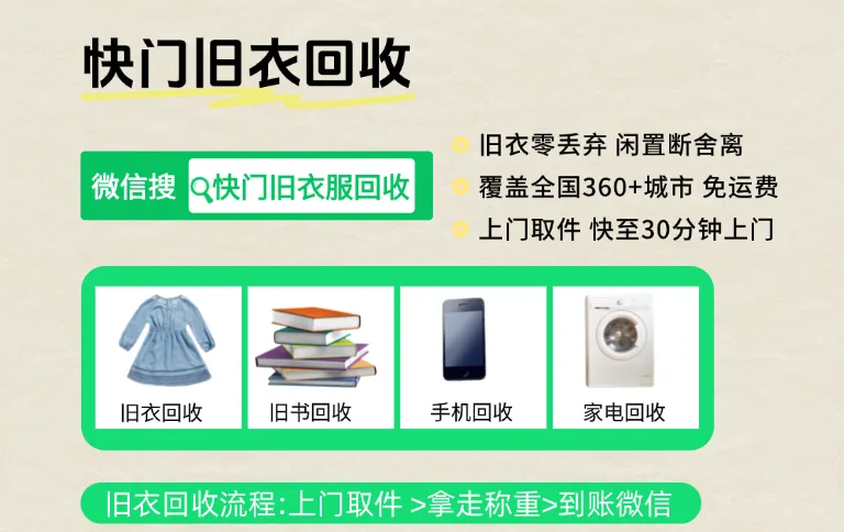 最近发现一个可以回收旧衣服的平台, “快门旧衣平台”这个小程序,可以环保回收旧衣服、旧鞋包、旧床单被罩、帽子围巾、毛绒玩具等,上门回收,按重量换钱,环保有偿,非常方便实用。他家免费上门回收,不用运费,预约完就有顺丰、京东快递员上门取件,回收的物品入库之后,会打款到小程序上,支持微信免费提现。