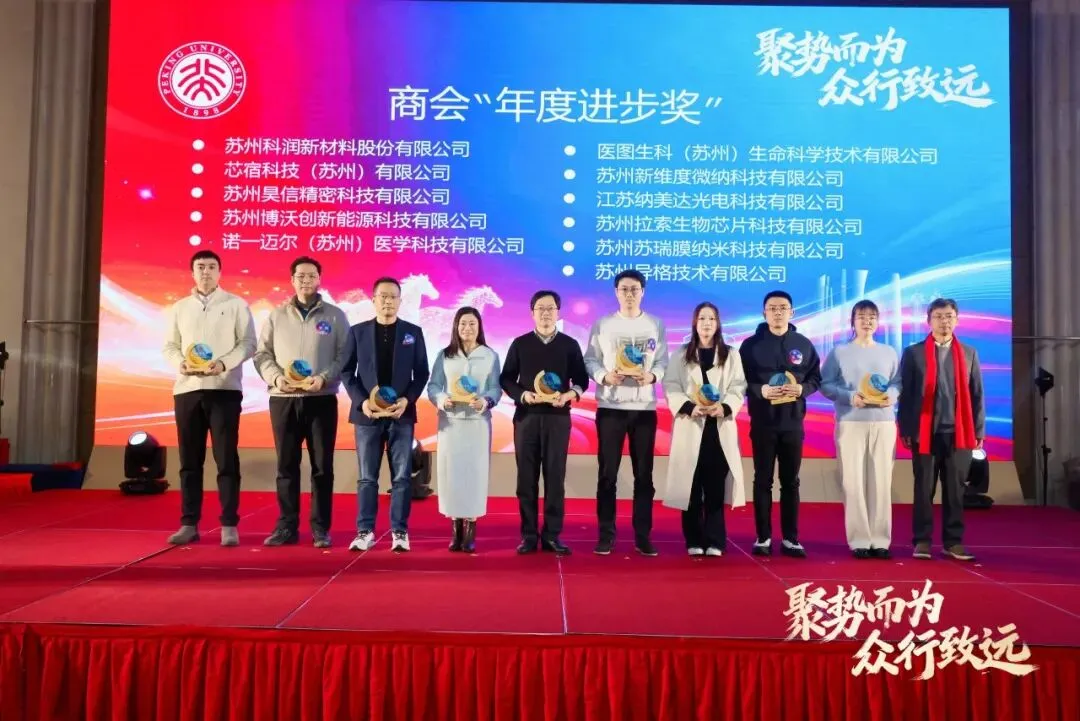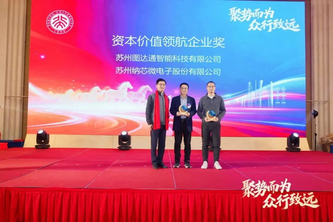 第三项 商会的年度“资本价值领航企业奖”备受瞩目,专门表彰在资本市场实现跨越式发展、树立行业标杆的优秀企业。其中,苏州图达通智能科技有限公司于 2025年12月10日通过De-SPAC模式登陆香港交易所主板,成为港交所第三家激光雷达领域上市公司,实现技术产业化与资本市场化的双重突破;苏州纳芯微电子股份有限公司作为科创板企业,2025年完成港股上市,成功构建“A+H”双资本市场布局,成为商会内首家达成这一成就的企业,为校友企业的资本市场发展之路带来了经验。企业发展离不开金融赋能。中信银行苏州分行作为北大商会战略合作银行,多年来始终与商会内多家企业携手同行,以专业金融服务助力企业深耕赛道、登陆资本市场。中信银行苏州分行党委书记、行长张凯先生为两家获奖企业颁奖,并在致辞中表示,中信银行将持续依托自身资源优势,深化与商会及校友企业的合作,为企业高质量发展提供更坚实的金融支撑,陪伴企业在资本市场稳健前行。