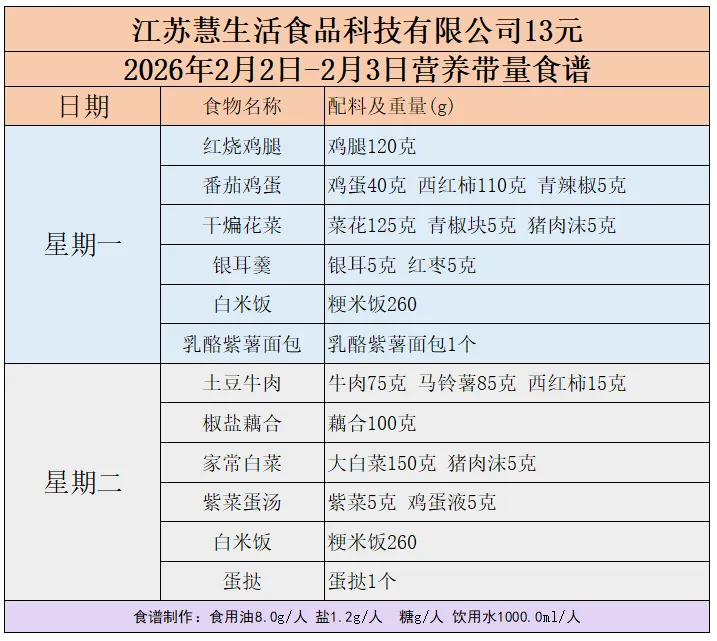 >徐州市北辰小学带量食谱公示(2026.02.02~2026.02.03)