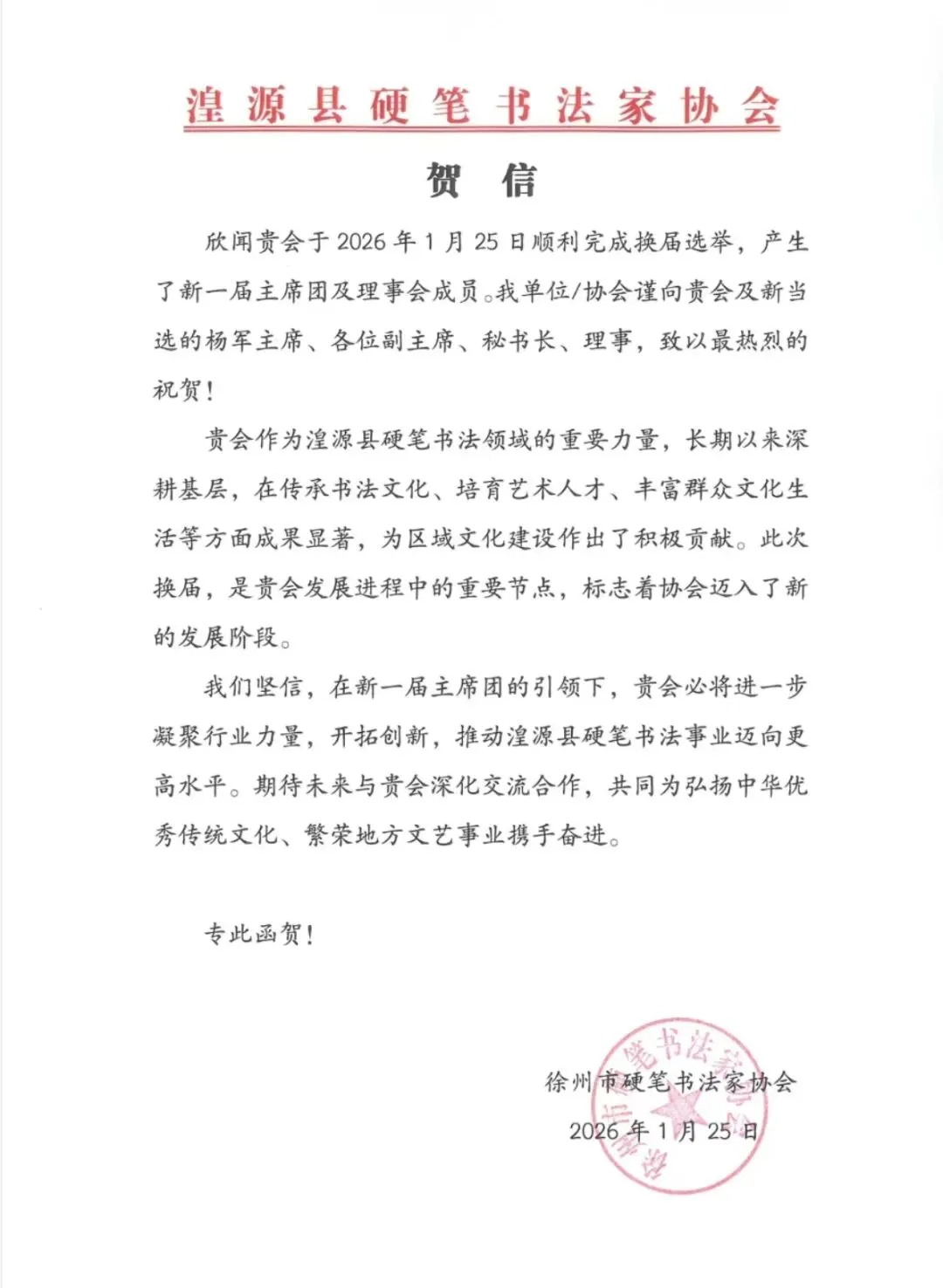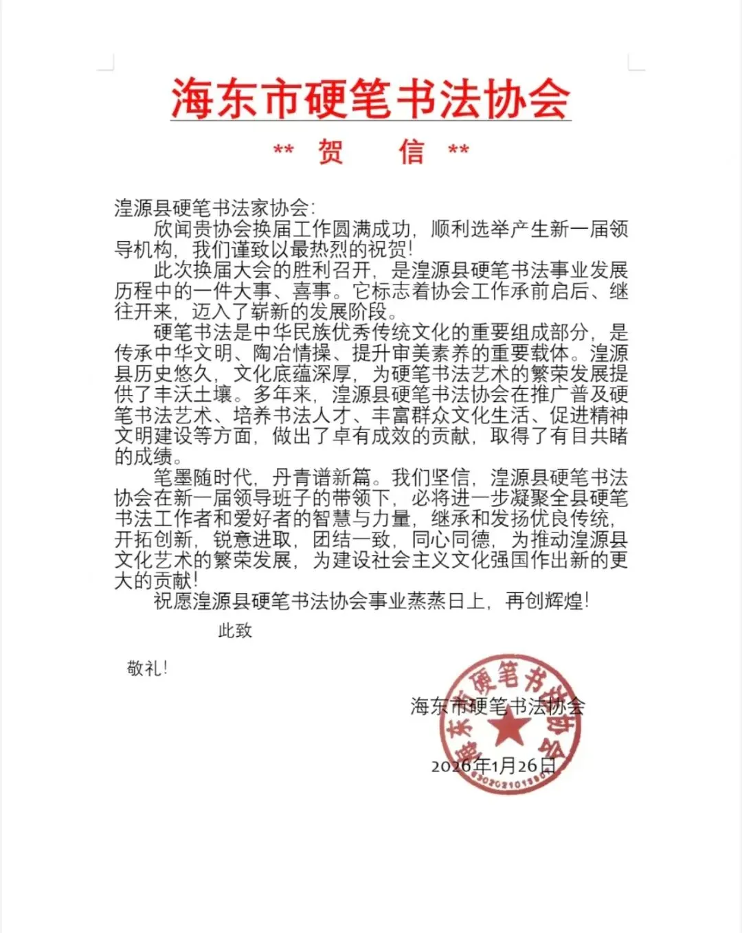 徐州市硬笔书法家协会、格尔木市硬笔书法家协会、海南州硬笔书画家协会,海东市硬笔书法家协会等协会发来贺信,表示对湟源县硬笔书法家协会换届成功的祝贺。
