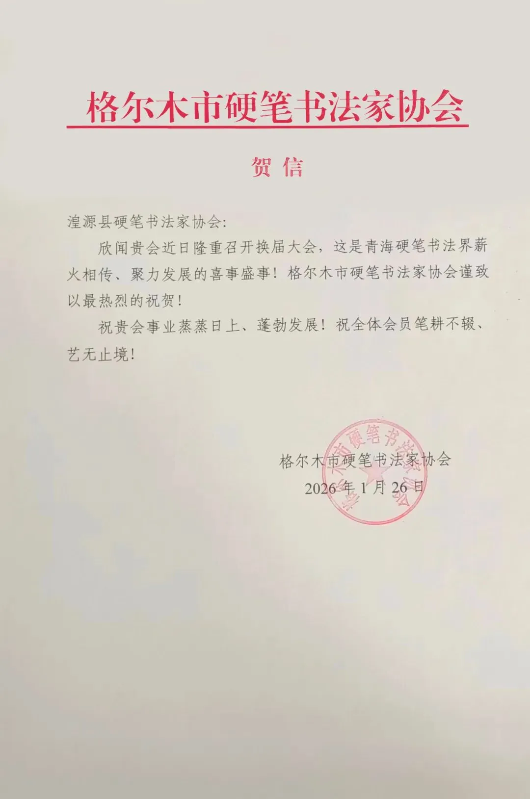 徐州市硬协、格尔木市硬协、海南州硬协,海东市硬协等协会发来贺信表示对湟源县硬笔书法家协会成功换届的祝贺.