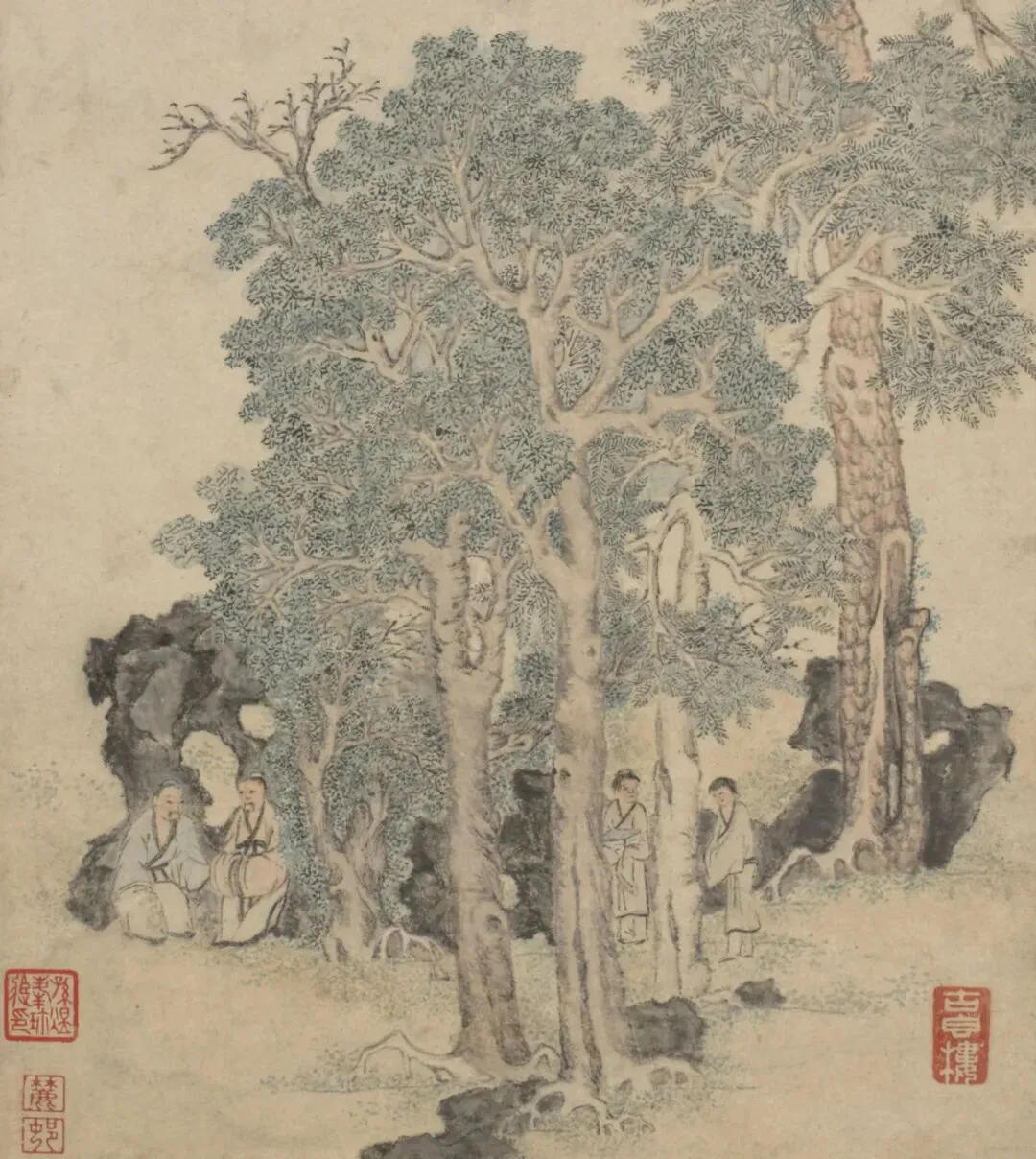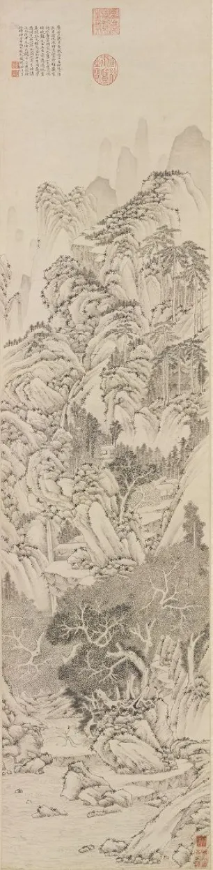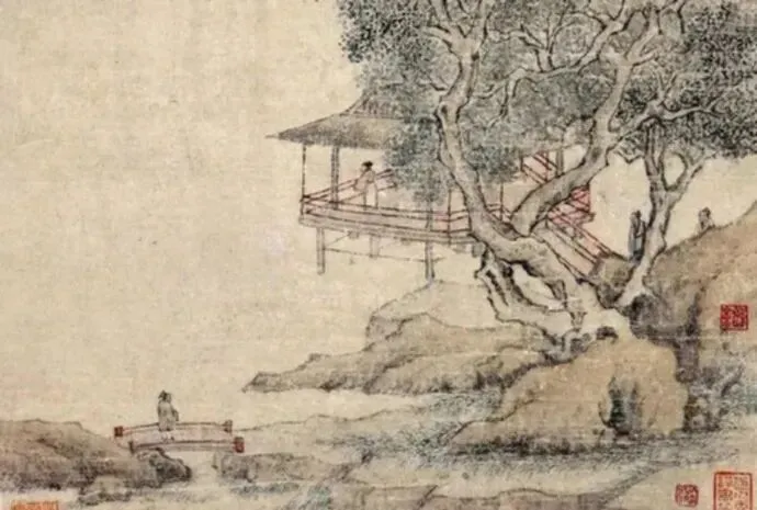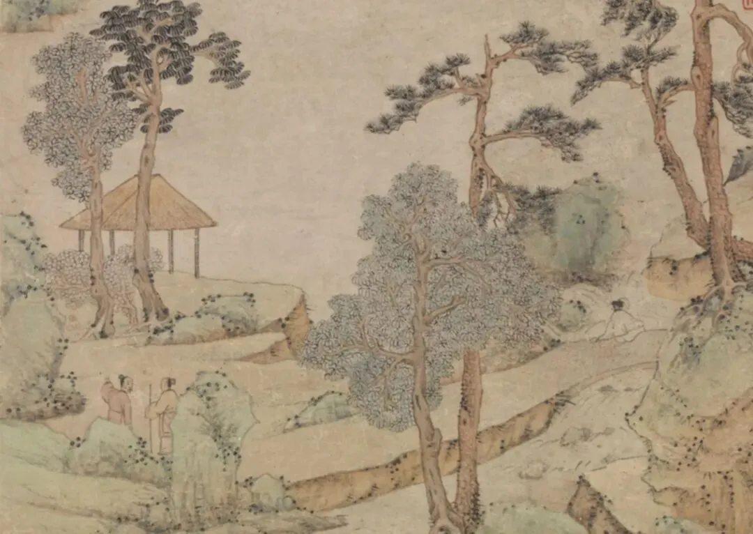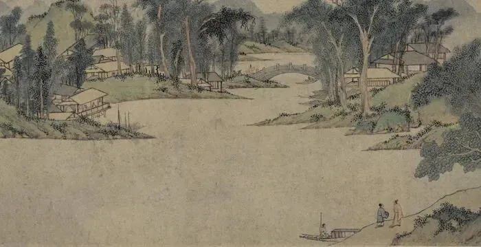 送别题材在苏州尤其常见,因为文人要赴试、外放、迁转;文徵明画《雨余春树图》这类作品,让两个人的告别嵌进山水之中,溪流的曲折带着视线往前走,离别成了一个可被观看的叙事。
