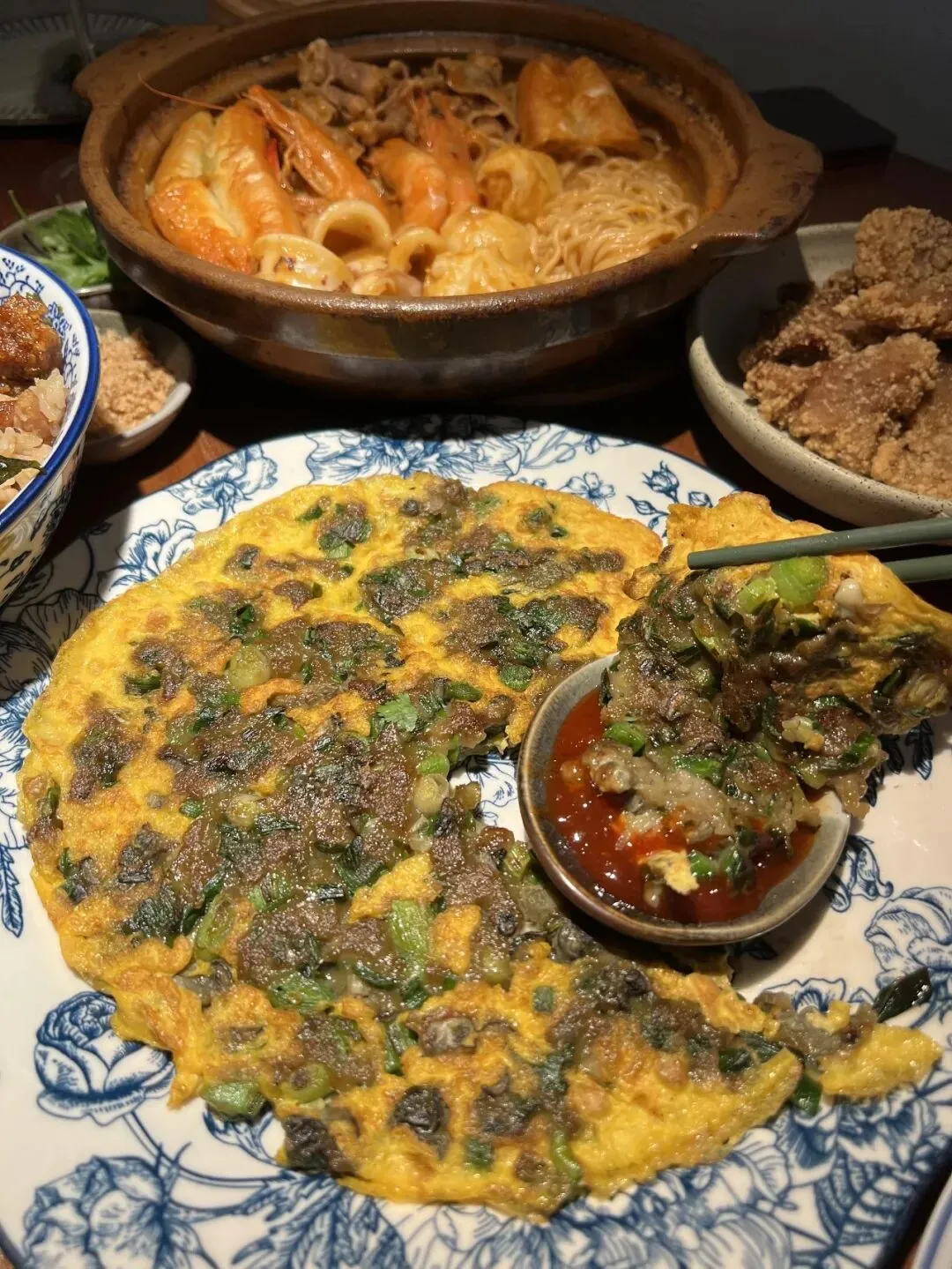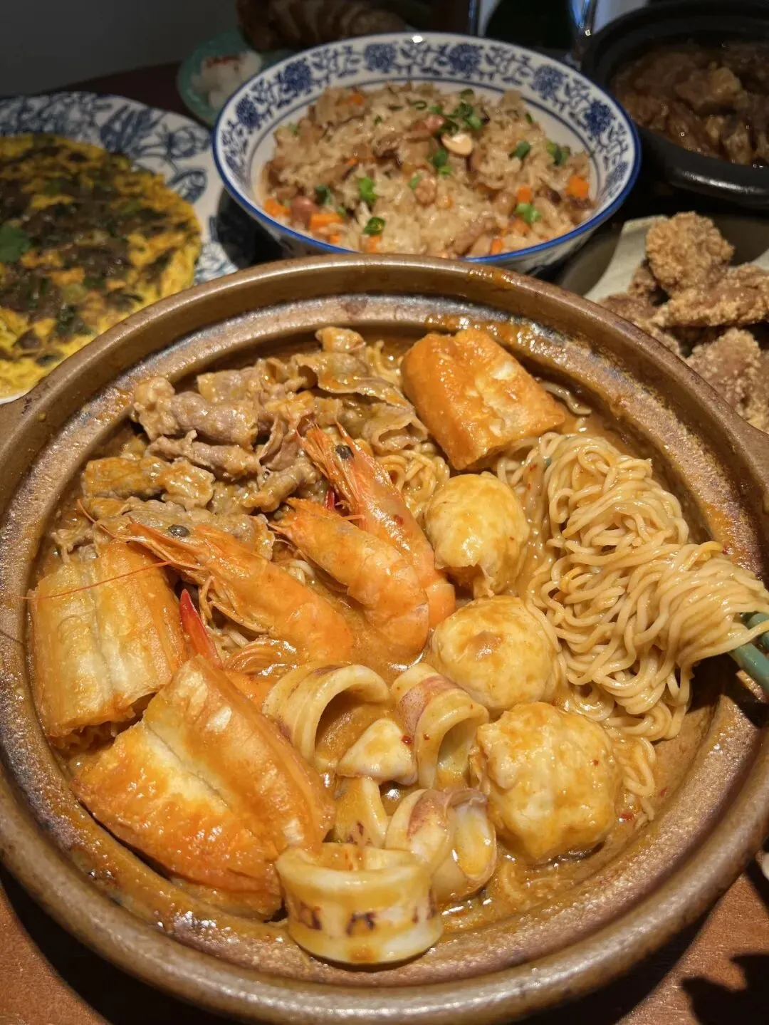 沙嗲肥牛伊面锅,很浓郁好吃的一锅,内容丰富,现熬骨汤制作的沙嗲,里面的肥牛、鱼丸、大虾、伊面、油条裹满沙嗲巨好吃!