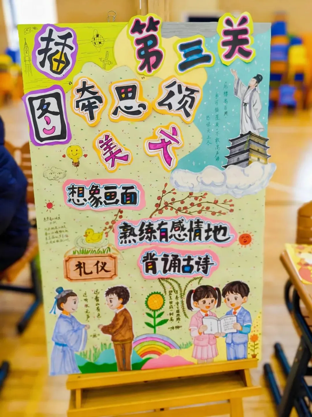 小月芽们声情并茂地吟诵出《敕勒歌》里“天苍苍,野茫茫,风吹草低见牛羊”的辽阔豪迈,《夜宿山寺》中“危楼高百尺,手可摘星辰”的惊险奇幻,还有《日月潭》里“日月潭很深,湖水碧绿。小岛把湖水分成两半,北边像圆圆的太阳,叫日潭;南边像弯弯的月亮,叫月潭”的优美意境,顺着吟诵流淌而出的是小月芽们的积极思维,他们从“会背”到“读懂”,从“记诵”到“体悟”,让经典诗文学习真正变成了文化浸润与思维生长的美妙旅程。