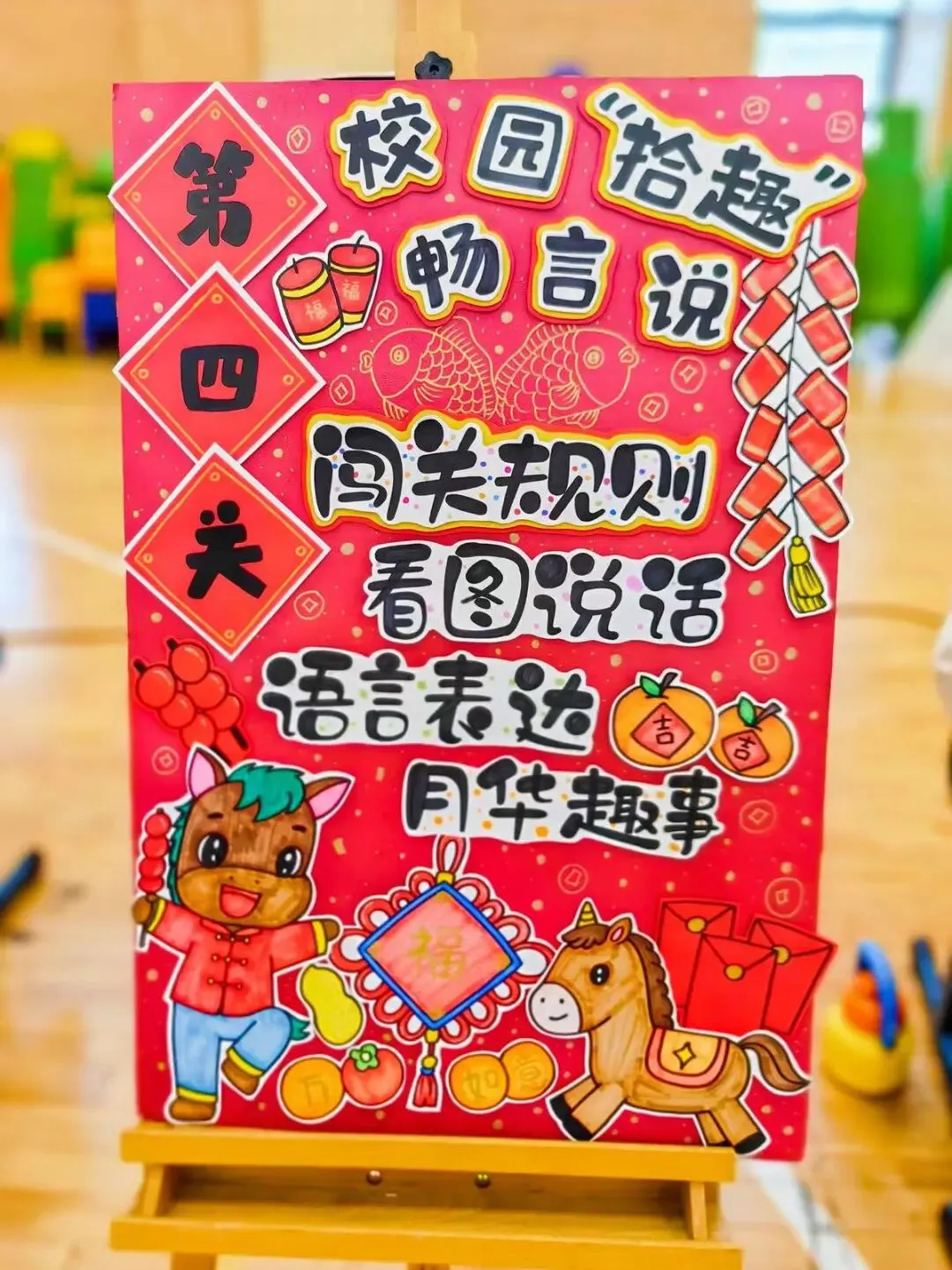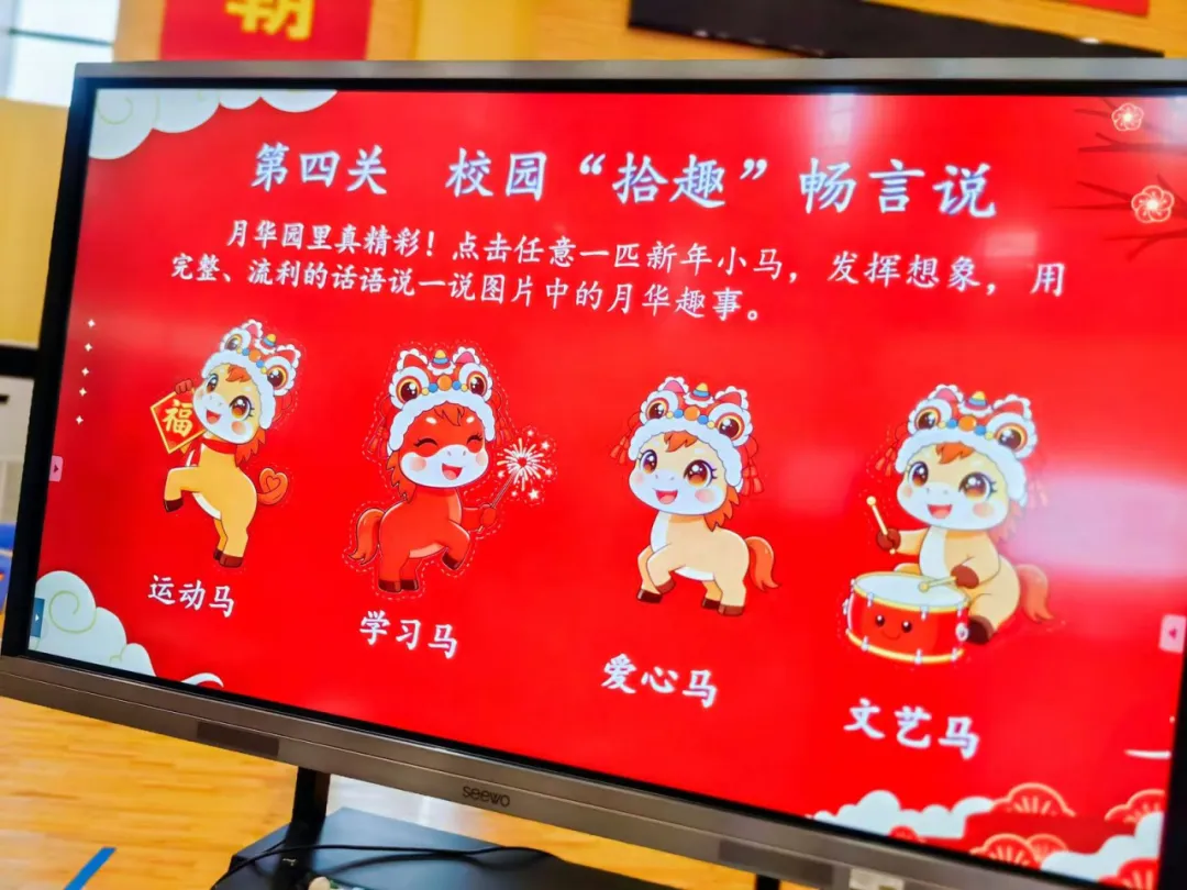 看!在“校园‘拾趣’畅言说”的闯关现场,满是小月芽们欢乐清脆的童言童语!大家排着队,兴致勃勃地挑选着大屏幕上呈现的“运动马、学习马、爱心马、文艺马”四张翻翻卡,手中教鞭点一点,专属挑战即刻开启!