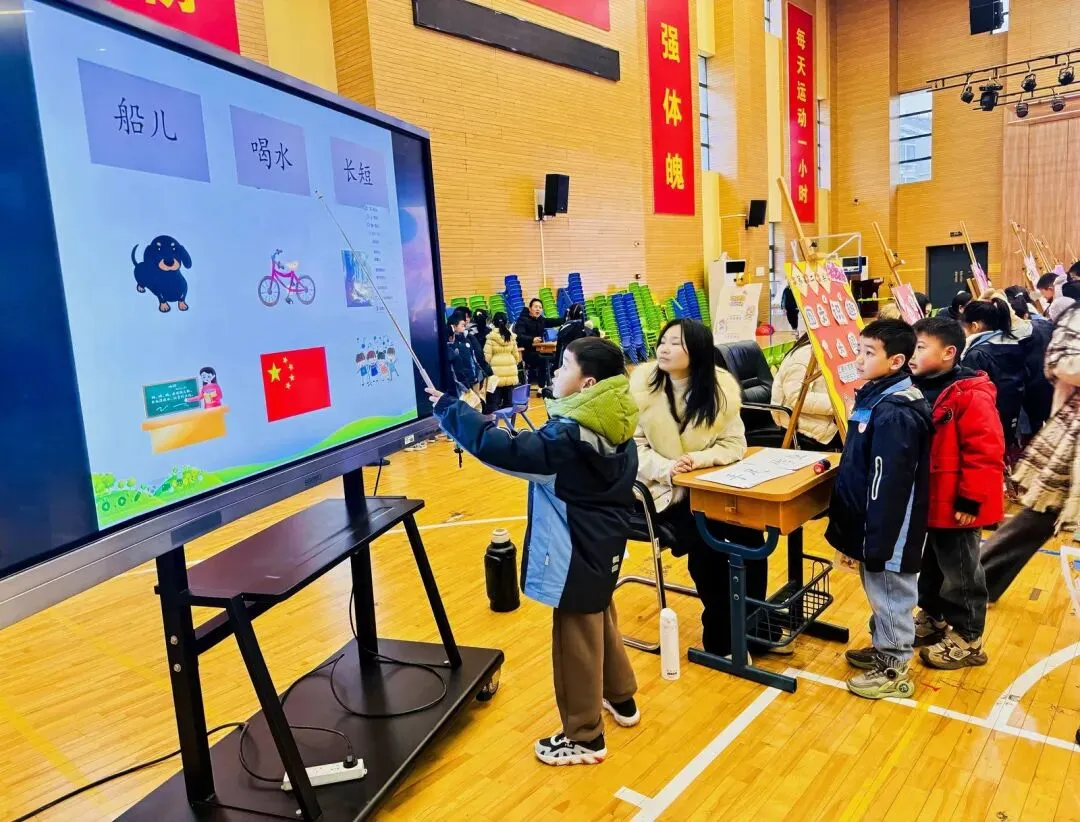 “船儿、喝水、长短......"小一萌娃们手拿小教鞭,化身小老师,奶声奶气地准确认读着屏幕上的词语,真是萌化了守关老师们的心。