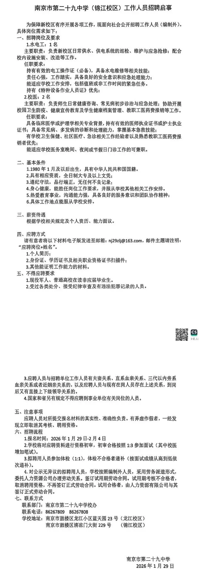 南京市第二十九中学(锦江校区)水电工、校医招聘公告