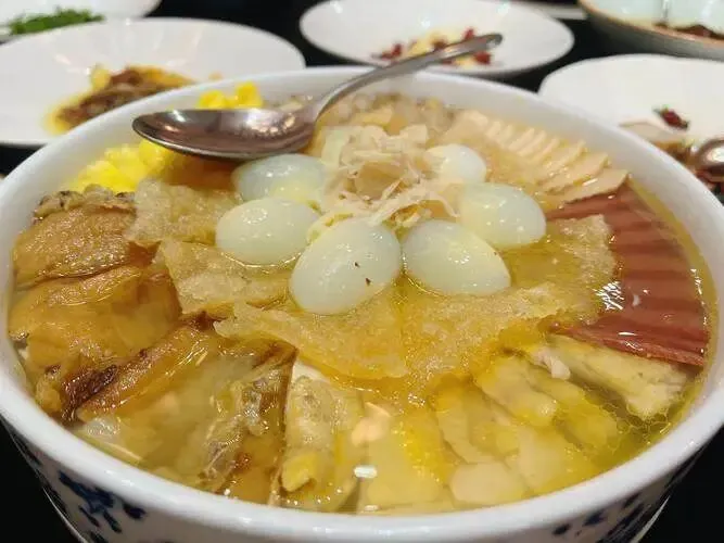 中午可以试试叫花鸡。不是那种真空包装的礼品鸡,而是现烤出来的。荷叶包着鸡肉,泥巴裹在外面,敲开泥巴的那一瞬间,热气腾腾,荷叶香混着鸡肉香,直往鼻子里钻。鸡肉酥烂脱骨,不用牙咬,抿一下就化了。