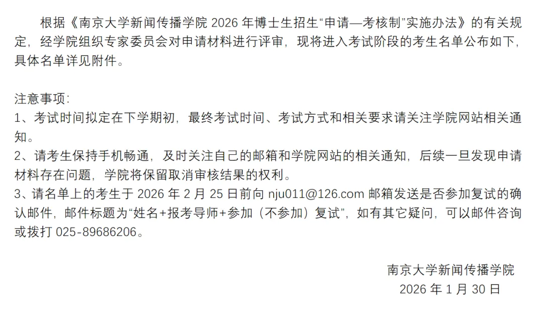 >南京大学新闻传播学院2026年博士招生材料审核结果公示