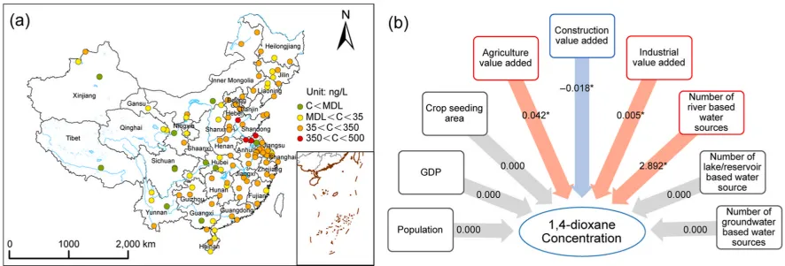 图 1.(a)中国内地各地自来4-二氧六环的浓度。C 表示 1,4-二氧六环的浓度,而 MDL 表示方法检测限(5.38 纳克/升)。(b)各种变量对饮用水中 1,4-二氧六环的影响(p < 0.05)。