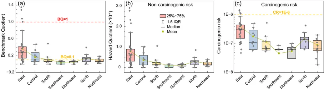 图 2. (a)不同地区人群通过饮用消化 1,4-二氧六环的基准商数(BQ),(b)危害商数(HQ),以及(c)致癌风险(CR)。