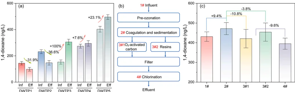 图 3. (a)五个饮用水处理厂进水和出水中 1,4-二氧六环的浓度。(b)饮用水处理厂 3 的主要处理工艺。(#)表示相关工艺后的采样点。(c)饮用水处理厂 3 不同处理工艺中 1,4-二氧六环的浓度。
