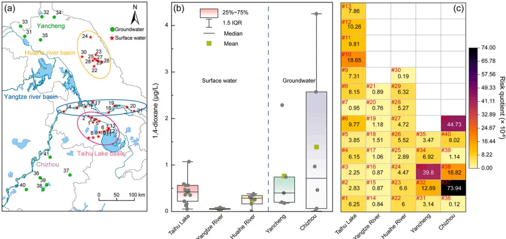 图 4. (a)采样点,(b)浓度,以及(c)地下水中和地表水中 1,4-二氧六环的风险商数。