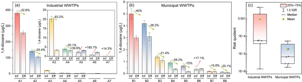 图 5. (a)工业污水处理厂和(b)城市污水处理厂中 1,4-二氧六环的浓度及去除率。(c)污水处理厂出水的风险商数。