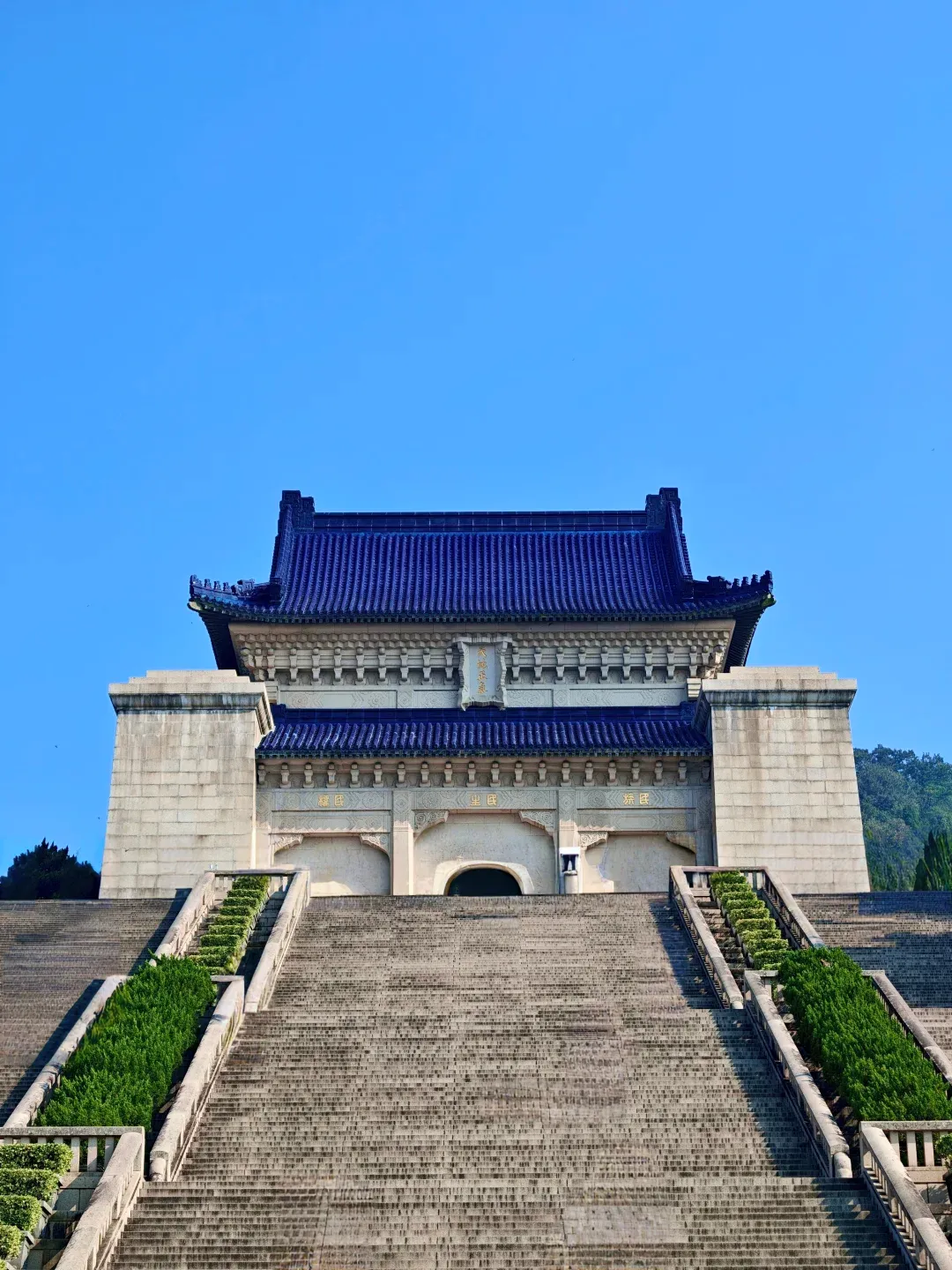 中山陵有典故,设计师吕彦直,建于1926到1929,牌坊匾上“天下为公”,石阶到顶是墓室外廊,抬头就是蓝天白云,天晴心里亮。台阶多,膝盖不行就分段停,台阶两侧有石凳。