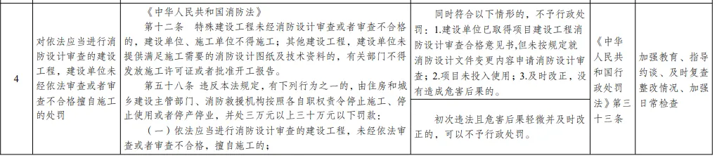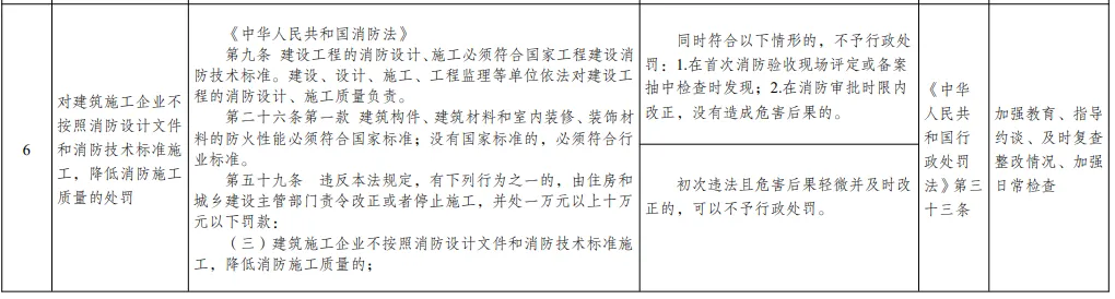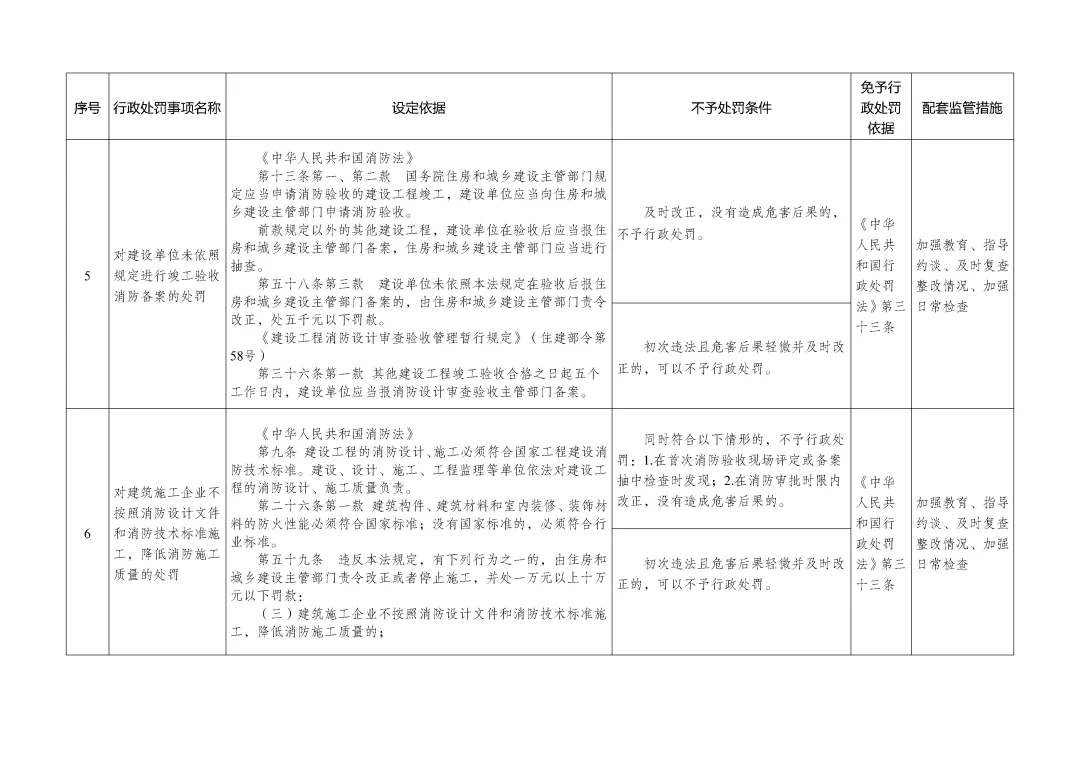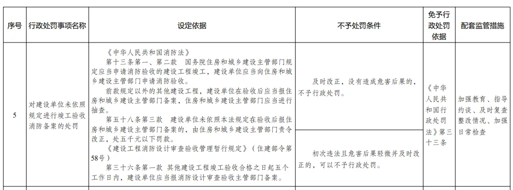 第二类情况:初次违法且危害后果轻微并及时改正的,可以不予行政处罚。4、免予行政处罚依据:《中华人民共和国行政处罚法》第三十三条5、配套监管措施:加强教育、指导约谈、及时复查整改情况、加强日常检查1、行政处罚事项名称:对建设单位未依照规定进行竣工验收消防备案的处罚。第十三条第一、第二款 国务院住房和城乡建设主管部门规定应当申请消防验收的建设工程竣工,建设单位应当向住房和城乡建设主管部门申请消防验收。前款规定以外的其他建设工程,建设单位在验收后应当报住房和城乡建设主管部门备案,住房和城乡建设主管部门应当进行抽查。第五十八条第三款 建设单位未依照本法规定在验收后报住房和城乡建设主管部门备案的,由住房和城乡建设主管部门责令改正,处五千元以下罚款。《建设工程消防设计审查验收管理暂行规定》(住建部令第58号)第三十六条第一款 其他建设工程竣工验收合格之日起五个工作日内,建设单位应当报消防设计审查验收主管部门备案。第一类情况:及时改正,没有造成危害后果的,不予行政处罚。第二类情况:初次违法且危害后果轻微并及时改正的,可以不予行政处罚。4、免予行政处罚依据:《中华人民共和国行政处罚法》第三十三条5、配套监管措施:加强教育、指导约谈、及时复查整改情况、加强日常检查(三)、施工企业不按设计和技术标准,降低消防施工质量1、行政处罚事项名称:对建筑施工企业不按照消防设计文件和消防技术标准施工,降低消防施工质量的处罚第九条 建设工程的消防设计、施工必须符合国家工程建设消防技术标准。建设、设计、施工、工程监理等单位依法对建设工程的消防设计、施工质量负责。