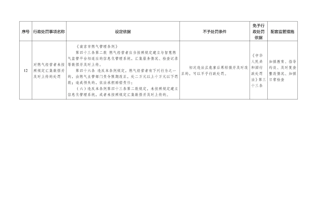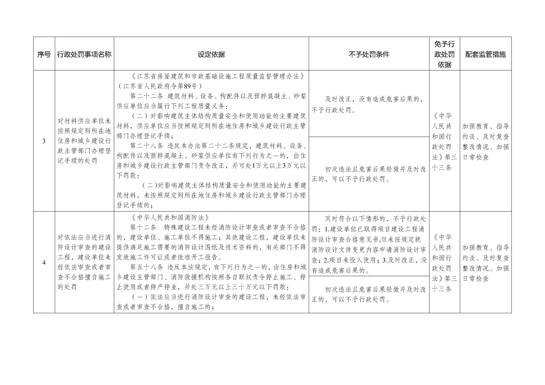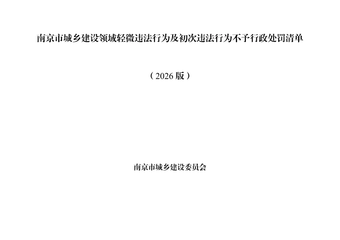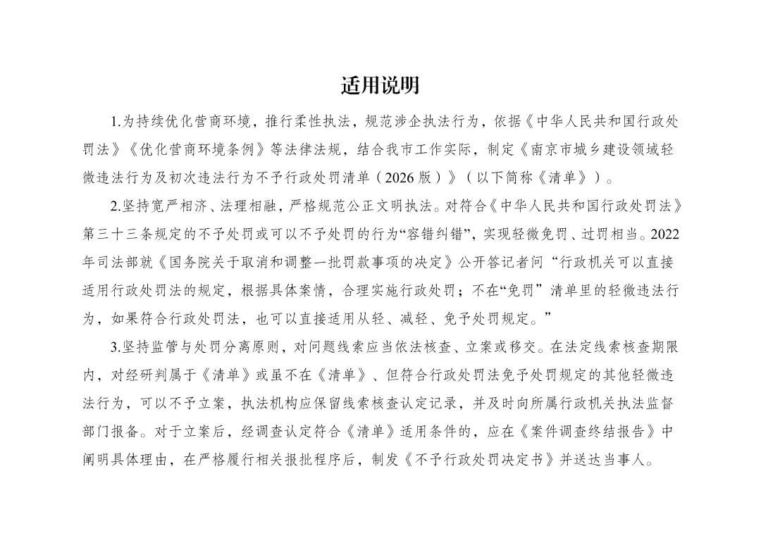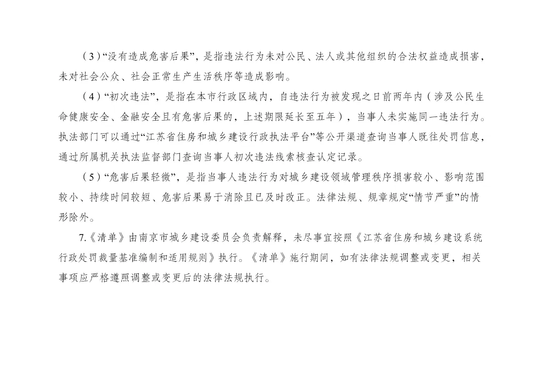 4、免予行政处罚依据:《中华人民共和国行政处罚法》第三十三条5、配套监管措施:加强教育、指导约谈、及时复查整改情况、加强日常检查(1)“违法行为轻微”,是指当事人无主观故意、违法行为持续时间较短或者辐射的区域范围和人群较小等情形。法律法规、规章规定“情节严重”的情形除外。违法行为属于危害公共安全、人身健康、生命财产安全、破坏市场公平竞争秩序和违反诚实信用原则的,不应当认定为法行为轻微。(2)“及时改正”,是指当事人在执法部门发现前主动改正或者在执法部门责令限期改正的期限内改正,有危害后果(相关影响)的已经消除的情形。除法律法规另有规定外,改正期限根据改正的难易程度及所需合理时间确定,除特殊情况外最长一般不超过 30 日。(3)“没有造成危害后果”,是指违法行为未对公民、法人或其他组织的合法权益造成损害,未对社会公众、社会正常生产生活秩序等造成影响。(4)“初次违法”,是指在本市行政区域内,自违法行为被发现之日前两年内(涉及公民生命健康安全、金融安全且有危害后果的,上述期限延长至五年),当事人未实施同一违法行为。执法部门可以通过“江苏省住房和城乡建设行政执法平台”等公开渠道查询当事人既往处罚信息,通过所属机关执法监督部门查询当事人初次违法线索核查认定记录。(5)“危害后果轻微”,是指当事人违法行为对城乡建设领域管理秩序损害较小、影响范围较小、持续时间较短、危害后果易于消除且已及时改正。法律法规、规章规定“情节严重”的情形除外。《南京市城乡建设领域轻微违法行为及初次违法行为不予行政处罚清单》原文