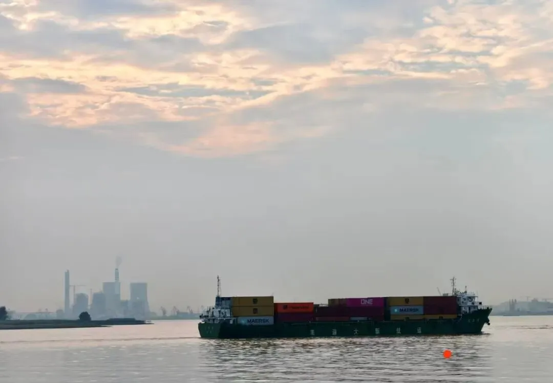 此刻,夕阳西下得更沉了。江岸两侧,赤色的码头吊机如巨人列阵,绵延十余公里,静静矗立于碧波之上,熠熠生辉。