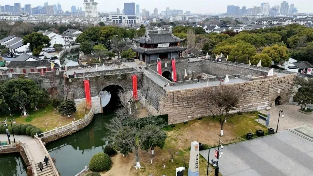 原名疁门,位于城东北,分外城、中城、内城三重,内城有城楼,南面有三道水城门,均备有闸门装置。城里和城外以外城河为界,以吊桥贯通。