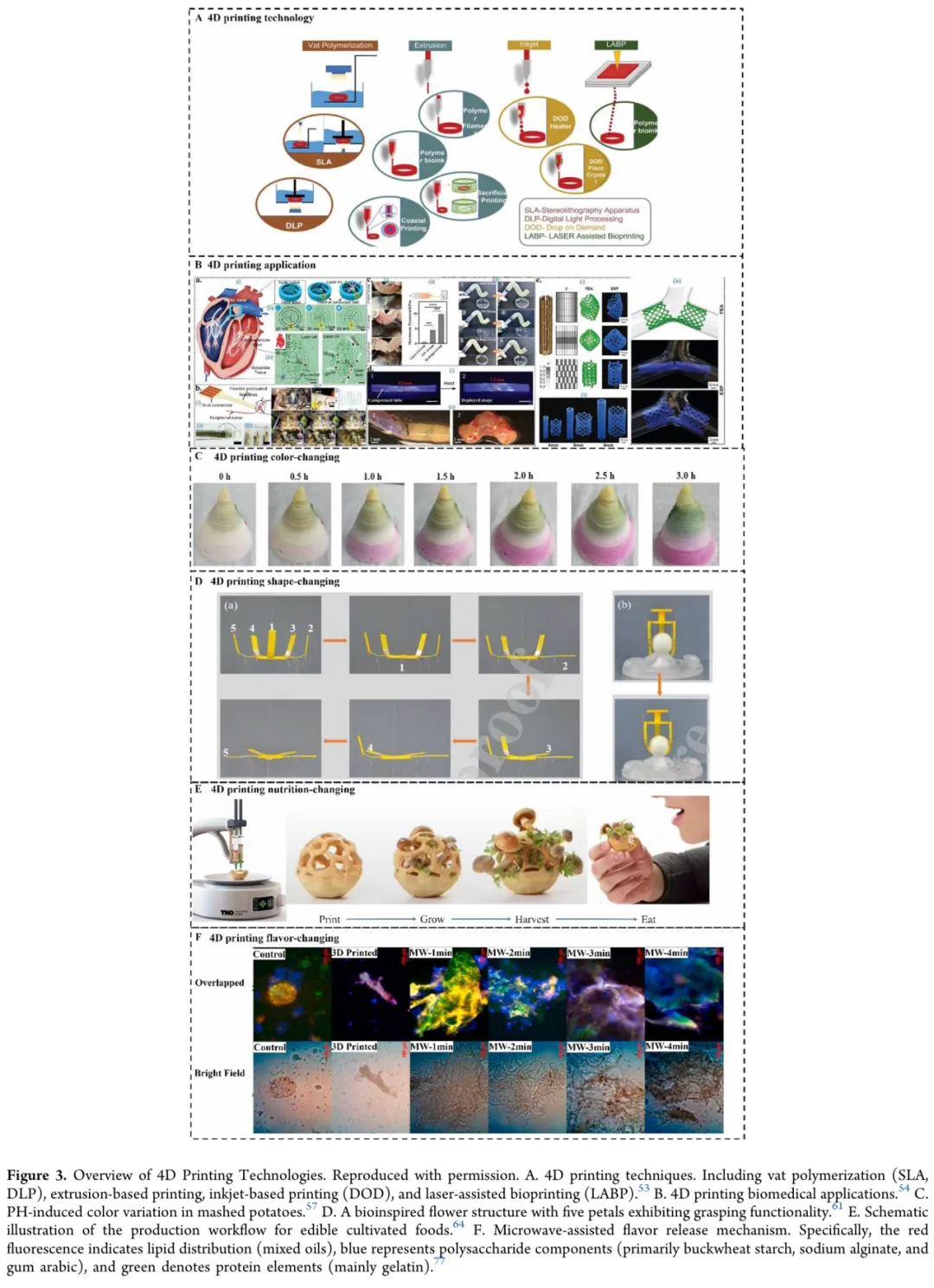 3D 打印凭借高精度和定制化优势,已实现副产物基功能食品(如吞咽困难患者专用食品、营养定制零食)的制备;4D 打印通过整合时间维度与智能材料,可实现食品颜色(pH 响应型色素)、形状(微波诱导形变)、营养(麦角固醇转化为维生素 D2)和风味(微胶囊刺激释放)的动态响应,提升食品功能性与交互性;5D/6D 打印虽处于发展阶段,但通过多轴运动或智能材料与多轴技术的结合,能制造更复杂、高强度的食品结构,为特殊场景食品(如易储存运输的薄壁食品、靶向营养释放食品)提供可能。