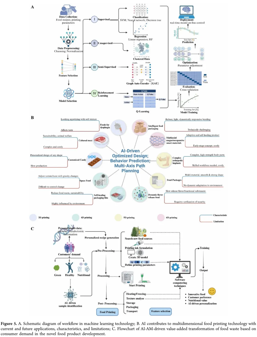 机器学习可有效解决传统打印中副产物墨水流变不稳定、配方优化低效等问题,通过预测墨水流变学特性、优化打印参数、实时监测打印缺陷,提升产品质量与生产效率。不同 AI 模型(随机森林、人工神经网络等)在打印适性预测、过程控制中表现出高准确性(如预测精度 82%-98.8%),能减少试错成本、缩短研发周期。AI 还支持个性化食品设计,可根据消费者 dietary 需求优化配方,实现从原料筛选到产品输出的智能化闭环。