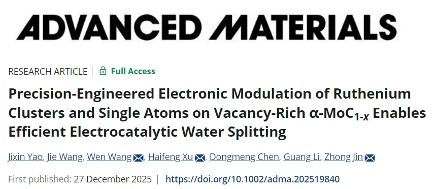 四校联合AM!南京大学「国家优青」金钟&合肥工业大学许海峰&巢湖大学王雯最新AM:调控α-MoC₁₋ₓ负载钌团簇与单原子实现高效水分解!