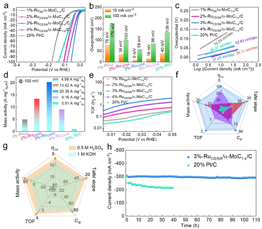图3a) 3%-RuCS/SA/α-MoC₁₋ₓ/C与20 wt% Pt/C及其他不同Ru负载量样品的极化曲线对比。b) 电流密度为10 mA cm⁻²和100 mA cm⁻²时的过电位。c) 由对应HER极化曲线导出的塔菲尔(Tafel)图。d) 相对于参比样品在-100 mV(vs RHE)下的质量活性。e) 相对于参比样品(不同Ru负载量)的转化频率(TOF)曲线。f) x%-RuCS/SA/α-MoC₁₋ₓ/C(x%代表2%、3%或4%的Ru负载比)与商用Pt/C电催化剂的HER性能指标对比。g) 3%-RuCS/SA/α-MoC₁₋ₓ/C在碱性电解质和酸性电解质(0.5 M H₂SO₄)下的HER性能指标对比。h) 3%-RuCS/SA/α-MoC₁₋ₓ/C与20% Pt/C在300 mA cm⁻²下的计时安培法测试(I-T)。