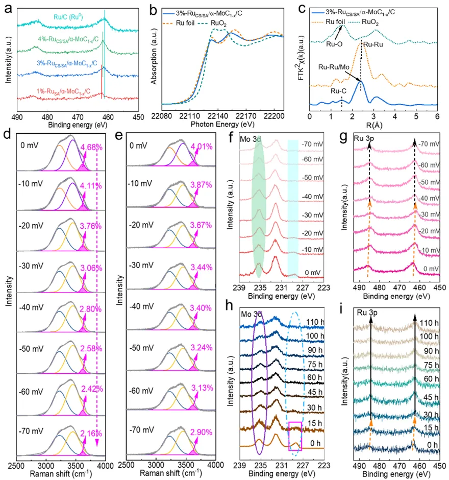 图4a) Ru 3p轨道的X射线光电子能谱(XPS)图。b) 3%-RuCS/SA/α-MoC₁₋ₓ/C、Ru箔和RuO₂的Ru K边X射线吸收近边结构(XANES)谱。c) 对应的Ru K边扩展X射线吸收精细结构(EXAFS)谱的傅里叶变换结果。d) 1%-RuSA/α-MoC₁₋ₓ/C界面水信号的原位拉曼光谱。e) 3%-RuCS/SA/α-MoC₁₋ₓ/C界面水信号的原位拉曼光谱。f,g) HER过程中3%-RuCS/SA/α-MoC₁₋ₓ/C的准原位Mo 3d和Ru 3p XPS谱分析。h,i) HER不同阶段的Mo 3d和Ru 3p XPS谱。
