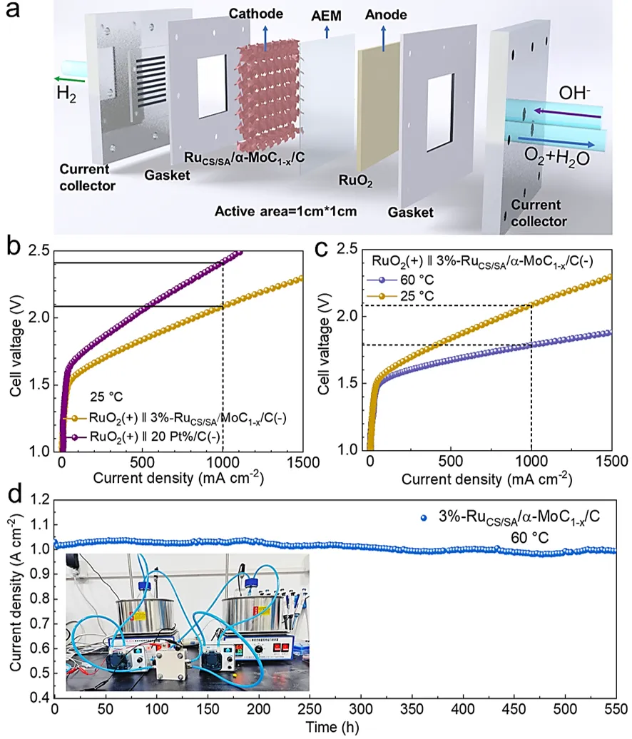 图5a) 阴离子交换膜水电解(AEMWE)装置示意图及碱性介质中AEMWE制氢示意图。b) 以3%-RuCS/SA/α-MoC₁₋ₓ/C和商用20% Pt/C为阴极催化剂的AEMWE在25℃下的极化曲线。c) 以3%-RuCS/SA/α-MoC₁₋ₓ/C为阴极催化剂的AEMWE在60℃和25℃下的极化曲线。d) 基于阴离子交换膜(AEM)的电解槽中3%-RuCS/SA/α-MoC₁₋ₓ/C在60℃下的耐久性测试。