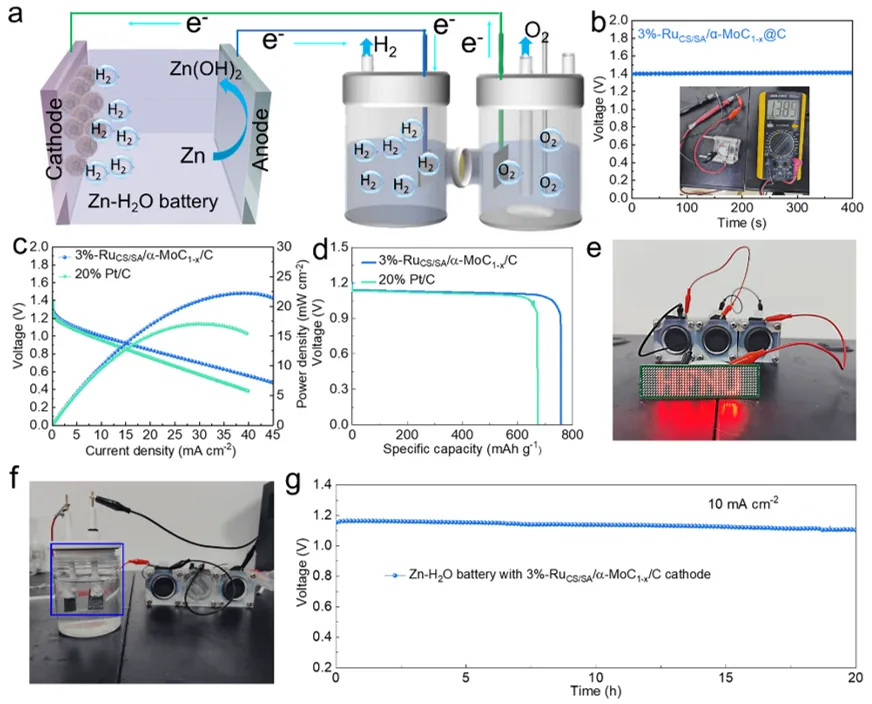 图6a) 双锌-水电池耦合配置驱动电催化水分解的示意图。b) 配备3%-RuCS/SA/α-MoC₁₋ₓ/C的锌-水电池的开路电位(OCP)。c) 配备3%-RuCS/SA/α-MoC₁₋ₓ/C的锌-水电池的线性扫描伏安曲线(LSV,左纵轴)及功率密度(右纵轴)。d) 3%-RuCS/SA/α-MoC₁₋ₓ/C与20% Pt/C的电压-比容量关系图。e) 由三个串联的装配式锌-水电池(采用3%-RuCS/SA/α-MoC₁₋ₓ/C阴极)点亮的十几个LED灯的照片。f) 由三个串联的锌-水燃料电池供电的水电解槽中阴极析氢反应(HER)和阳极析氧反应(OER)的数码照片。g) 采用3%-RuCS/SA/α-MoC₁₋ₓ/C的锌-水电池的长期耐久性测试。