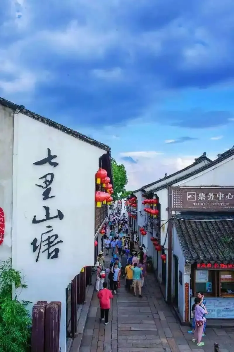 随后我们去了山塘街,这里的人多到数不清,真是人山人海。我被裹入拥挤的人群中,不用迈步就被人流推着往前走,街边的古建筑和红灯笼特别好看。傍晚我们坐上游船夜游山塘街,两岸的灯光倒映在水里,波光粼粼的,美得像一幅画。