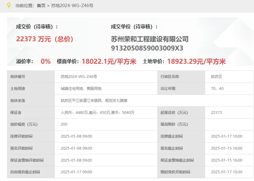 云栖海棠里,即,苏地2024-WG-Z46号地块,位于姑苏区平江街道江宇路西、规划支七路南,是1月17日,苏州荣和工程建设有限公司以底价22373万元竞得,成交楼面价18022元/平。